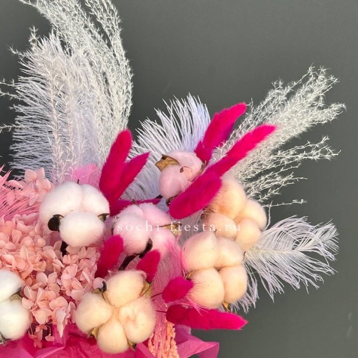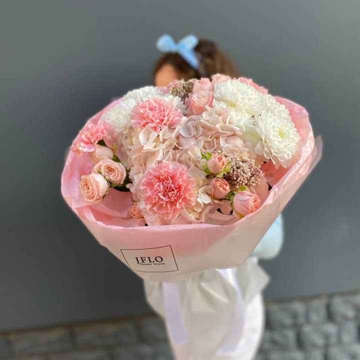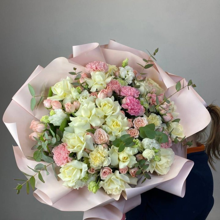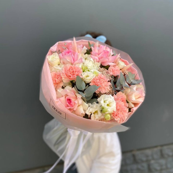 Ассортимент рабочий, под разные поводы. Розы Red Naomi и Freedom от 50 до 70 см стебель, кустовые хризантемы, альстромерия, гипсофила, эустома, эвкалипт. В сезон — пионы (конец мая — июнь), ранункулюсы зимой и ранней весной, тюльпаны весной. Авторские миксы с эвкалиптом и лавандой — для тех, кому нужна небанальная композиция.