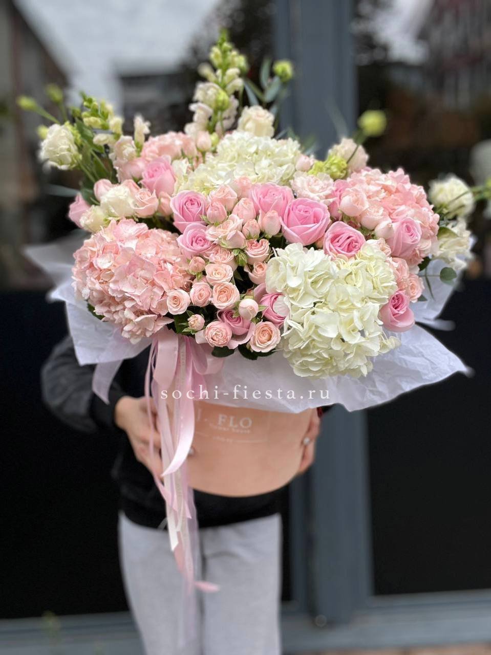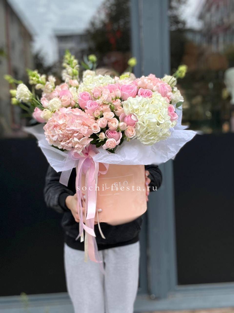 нежный бокс из французских роз сорта Венди, цилиндр D13, эвкалипт, лента, упаковка.