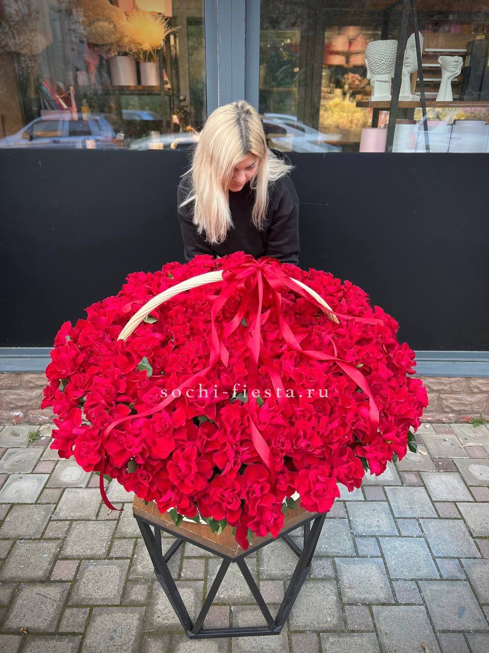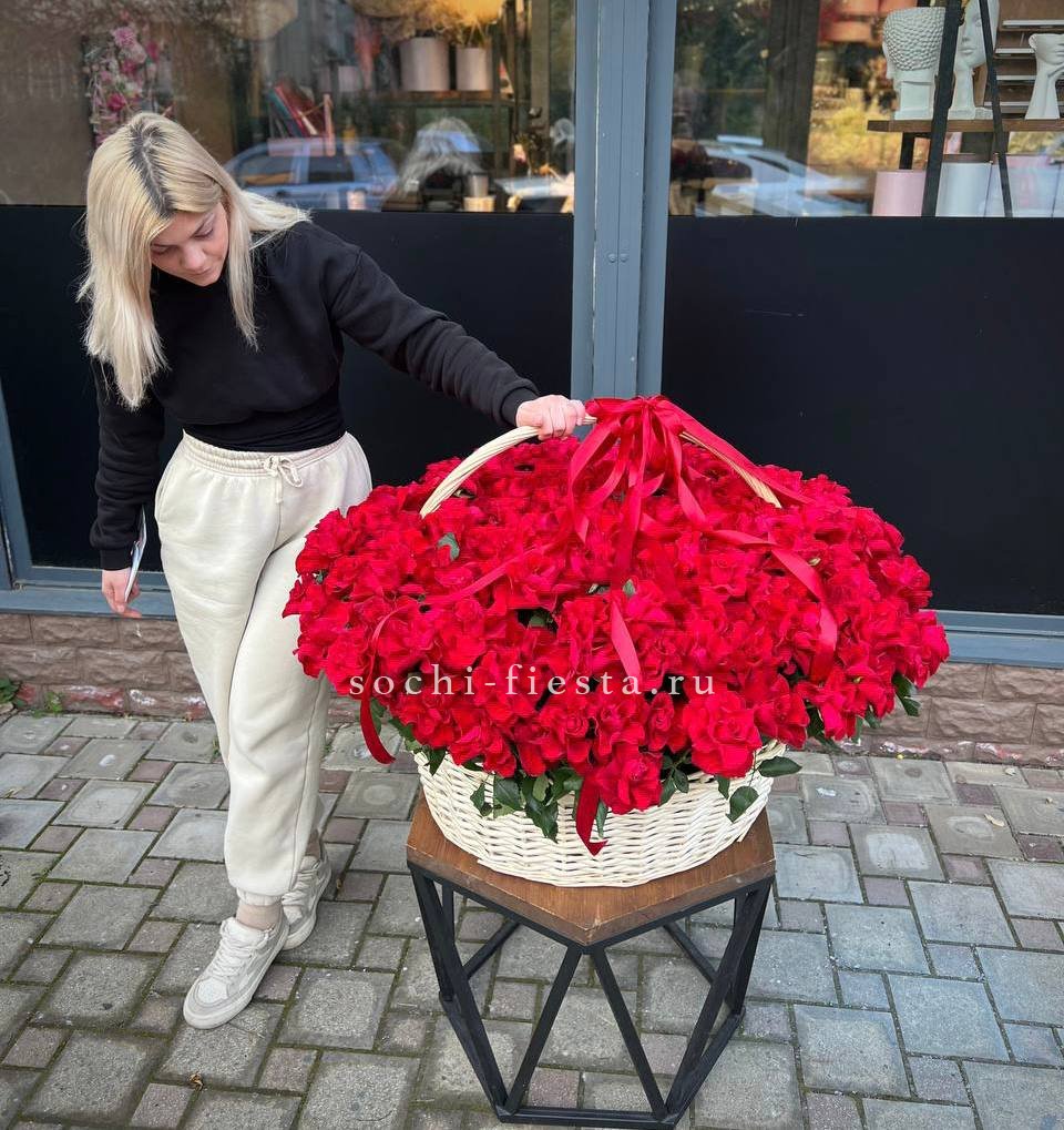 Двести одна роза глубокого красного оттенка собрана в просторной корзине. Плотное заполнение создает цельную бархатистую поверхность, где каждый бутон дополняет соседний. Масштабная композиция для выражения самых сильных чувств.