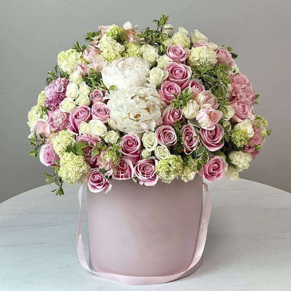 Пышная композиция с насыщенным цветением и многослойной глубиной. Пионовидные формы переплетаются с воздушной эустомой, создавая объём и плавный переход от центра к краям. Каждый бутон раскрыт по-своему.