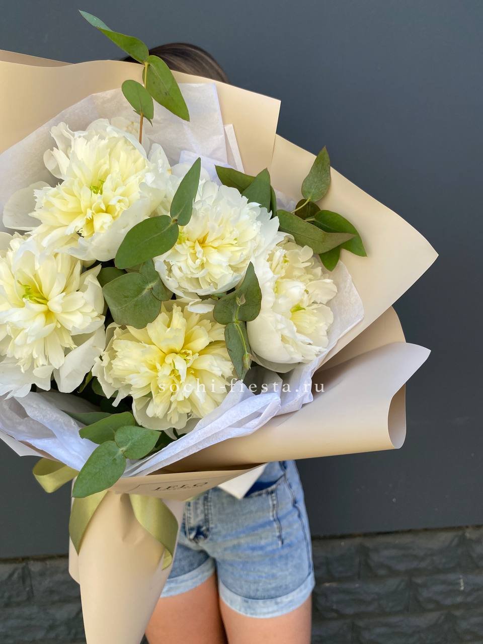 пионы, эвкалипт, лента и дизайнерская пленка.