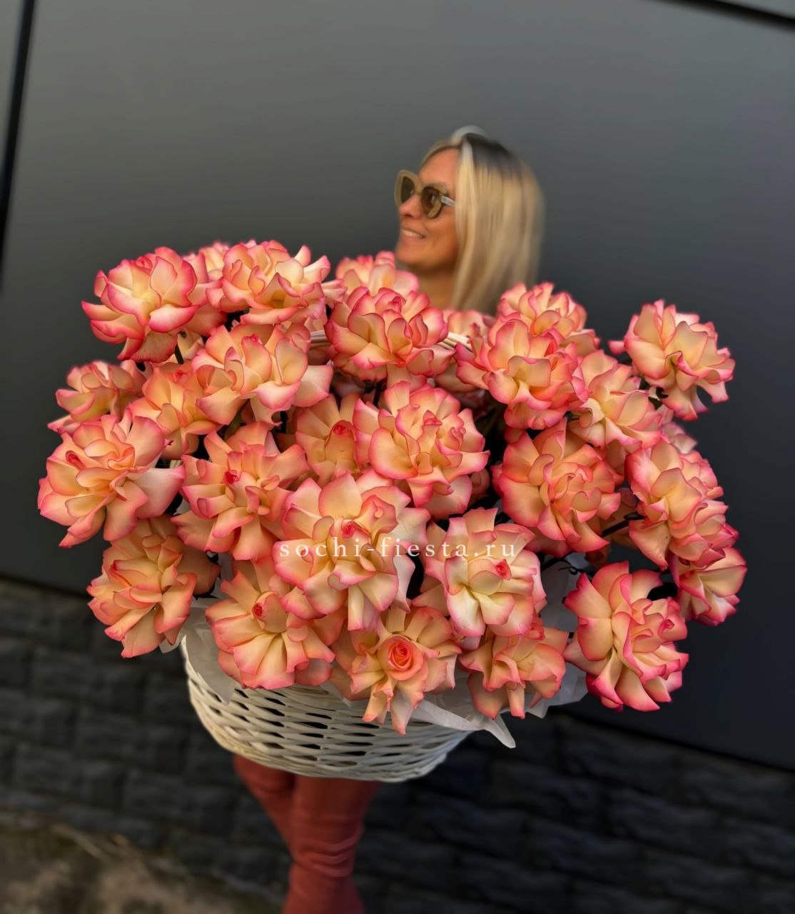 Пятьдесят пять бутонов создают объемную композицию с выразительным силуэтом. Розовый цвет наполняет пространство светом. Авторское оформление завершает образ.