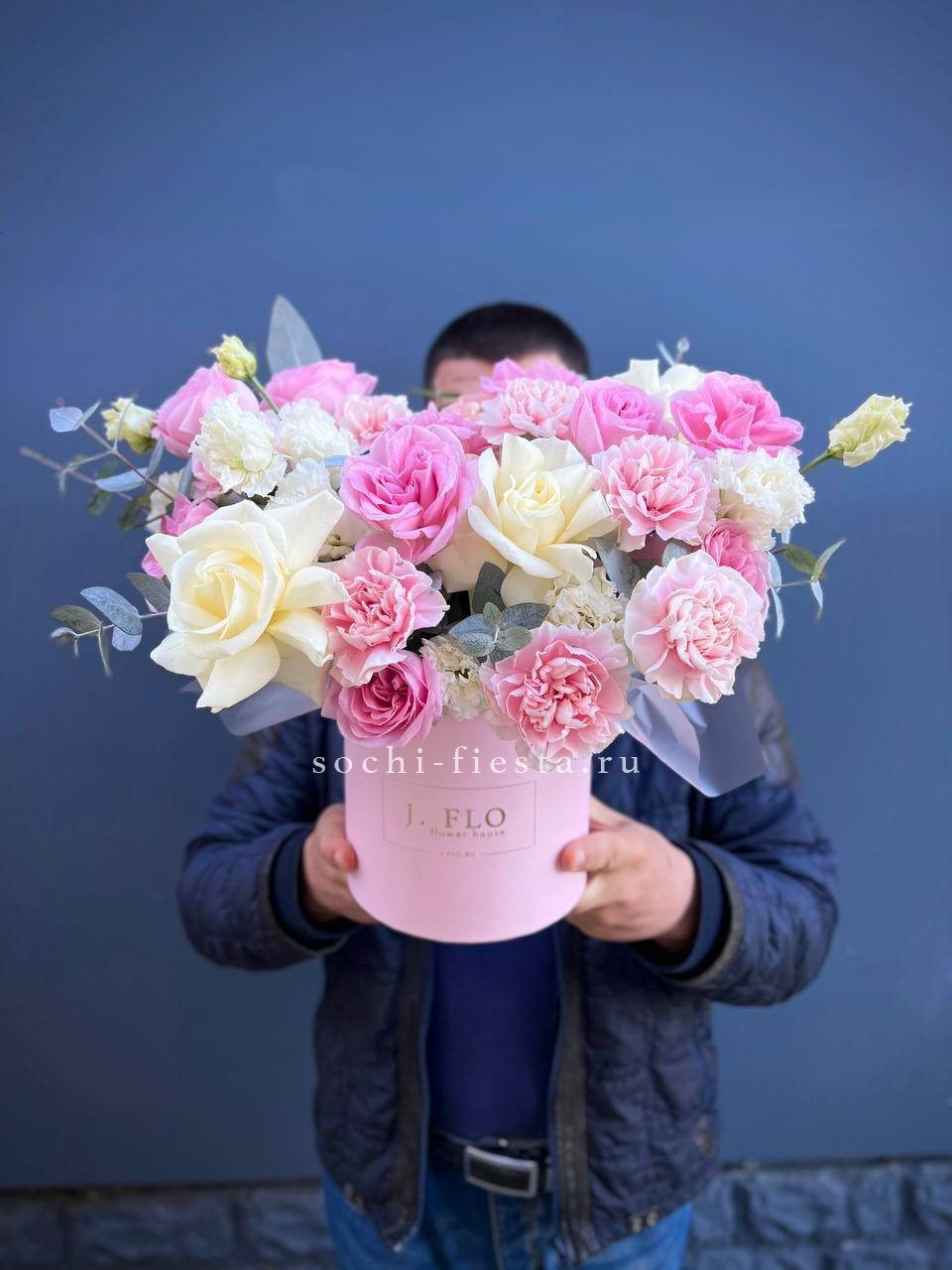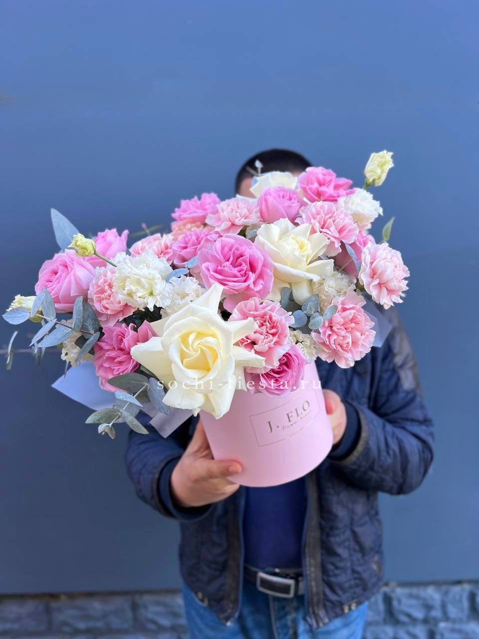 гортензия, бомбастик, розовые розы в нежном оформлении.