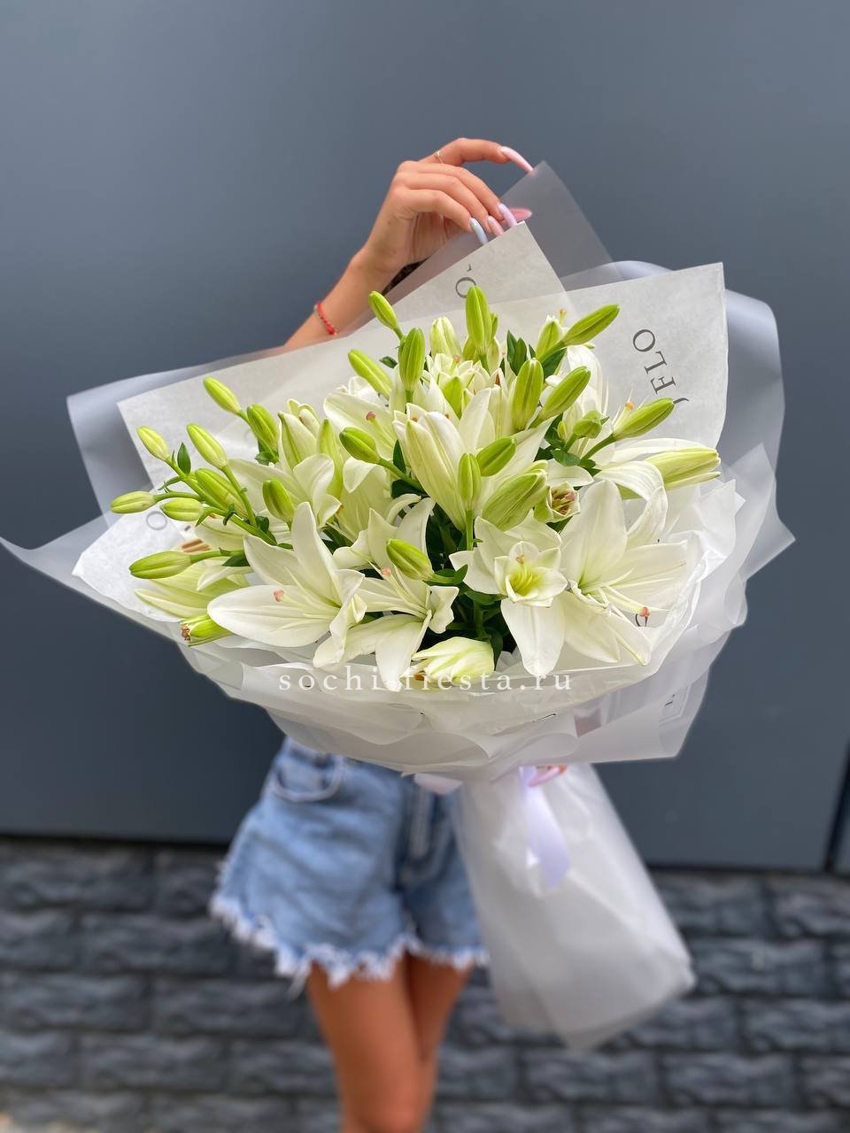 Семь лилий собраны в лёгкую композицию с вертикальным силуэтом. Бутоны раскрываются постепенно и наполняют пространство свежим ароматом. Букет подходит для интерьеров в светлых тонах и создаёт ощущение простора.