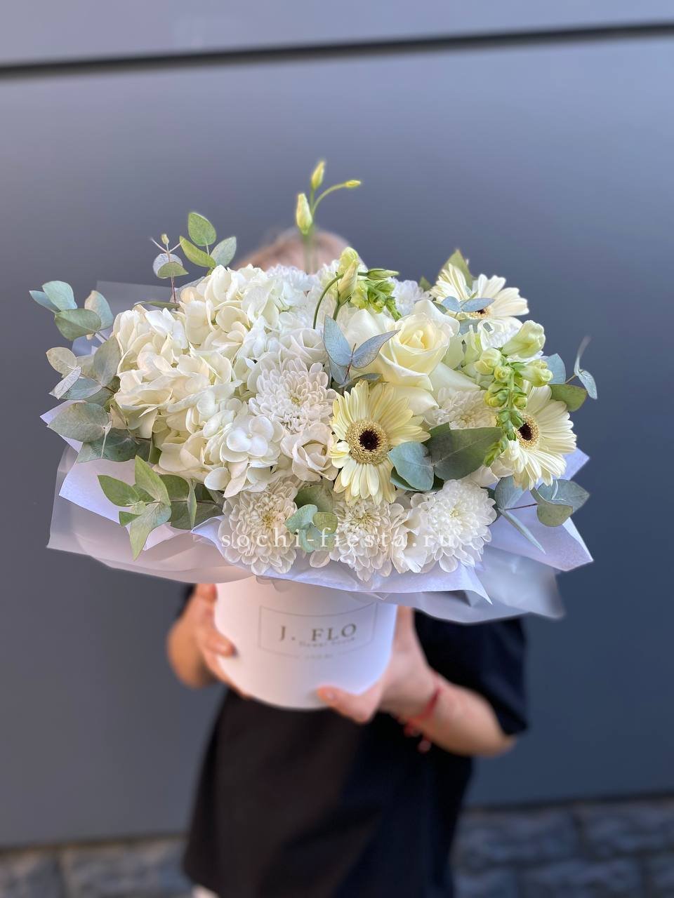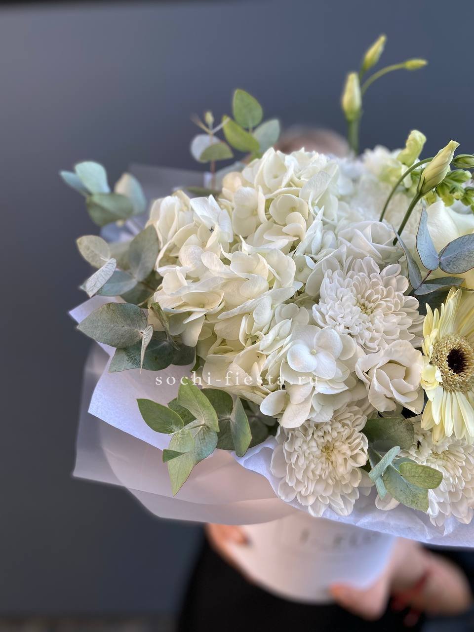 Пышные бутоны Сара Бернар раскрываются среди лепестков роз и воздушной гортензии. Эустома добавляет графичности, а эвкалипт собирает композицию в единый силуэт. Цветовая гамма плавно перетекает от розового к голубому.