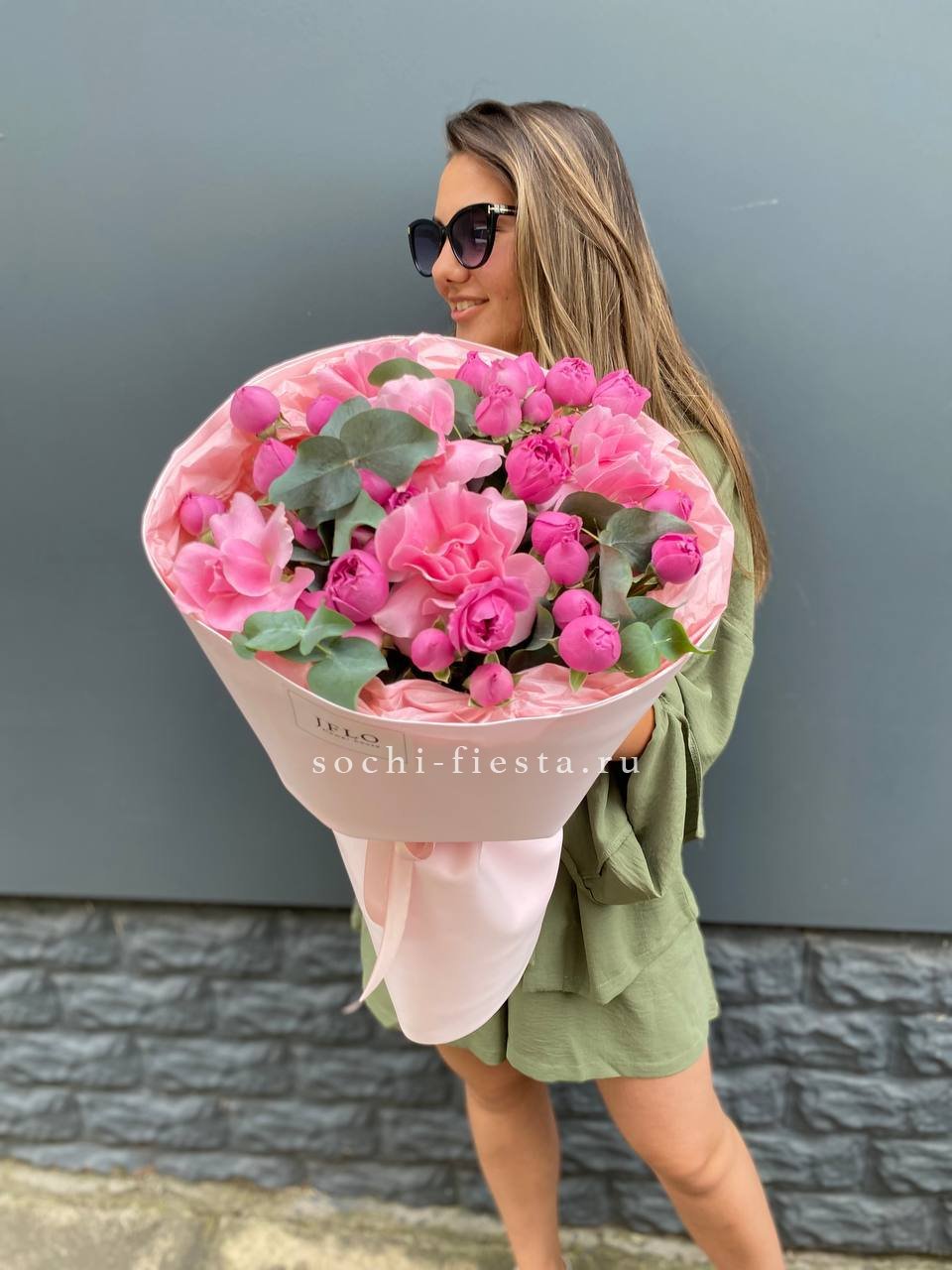 Розовая гамма раскрывается через махровые пионовидные бутоны и классические розы с плотной текстурой лепестков. Эвкалипт вплетается в композицию, создавая свежий акцент.