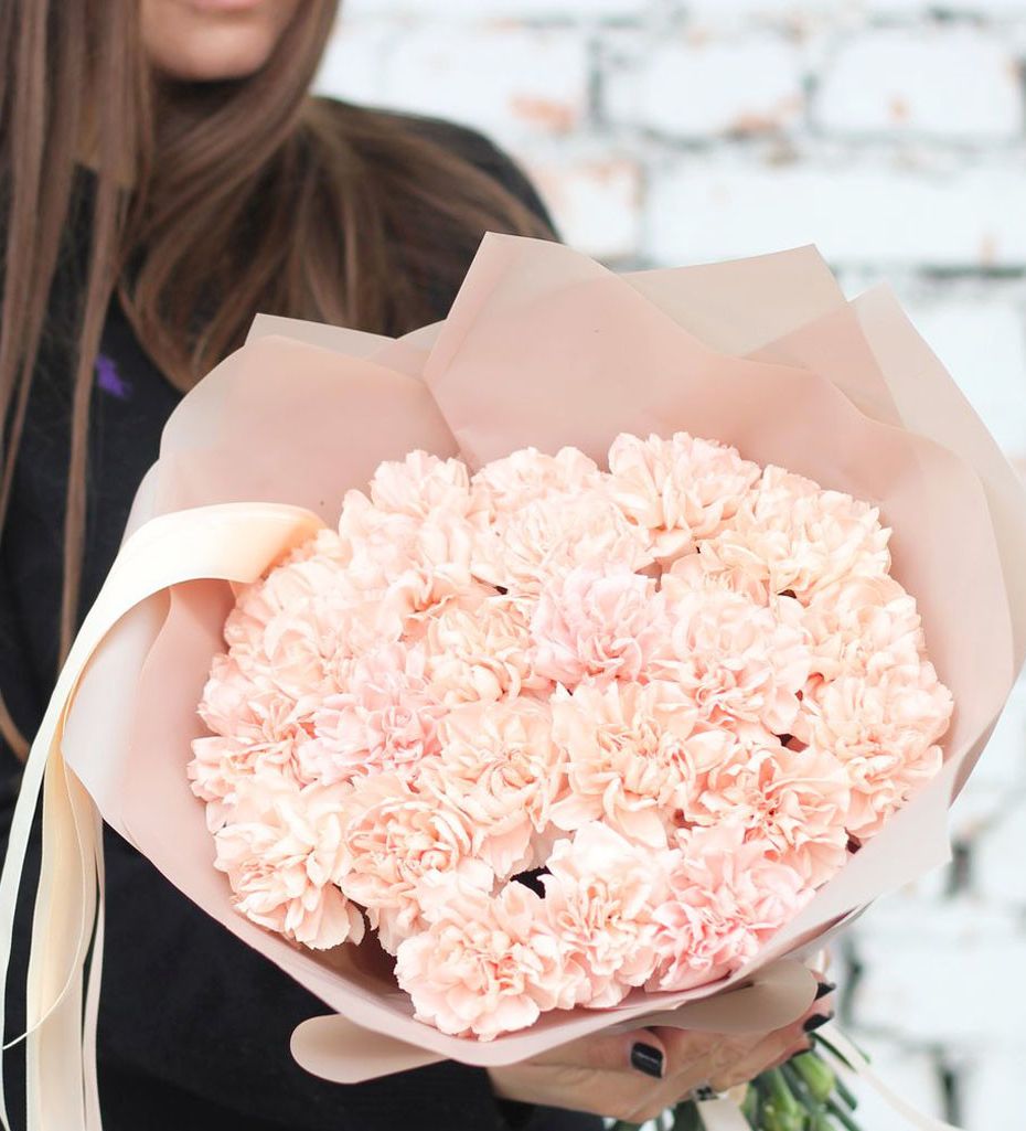 Семь кремовых диантусов раскрываются мягкими многослойными головками. Эвкалипт добавляет воздуха между бутонами и создает легкую асимметрию в общей форме.