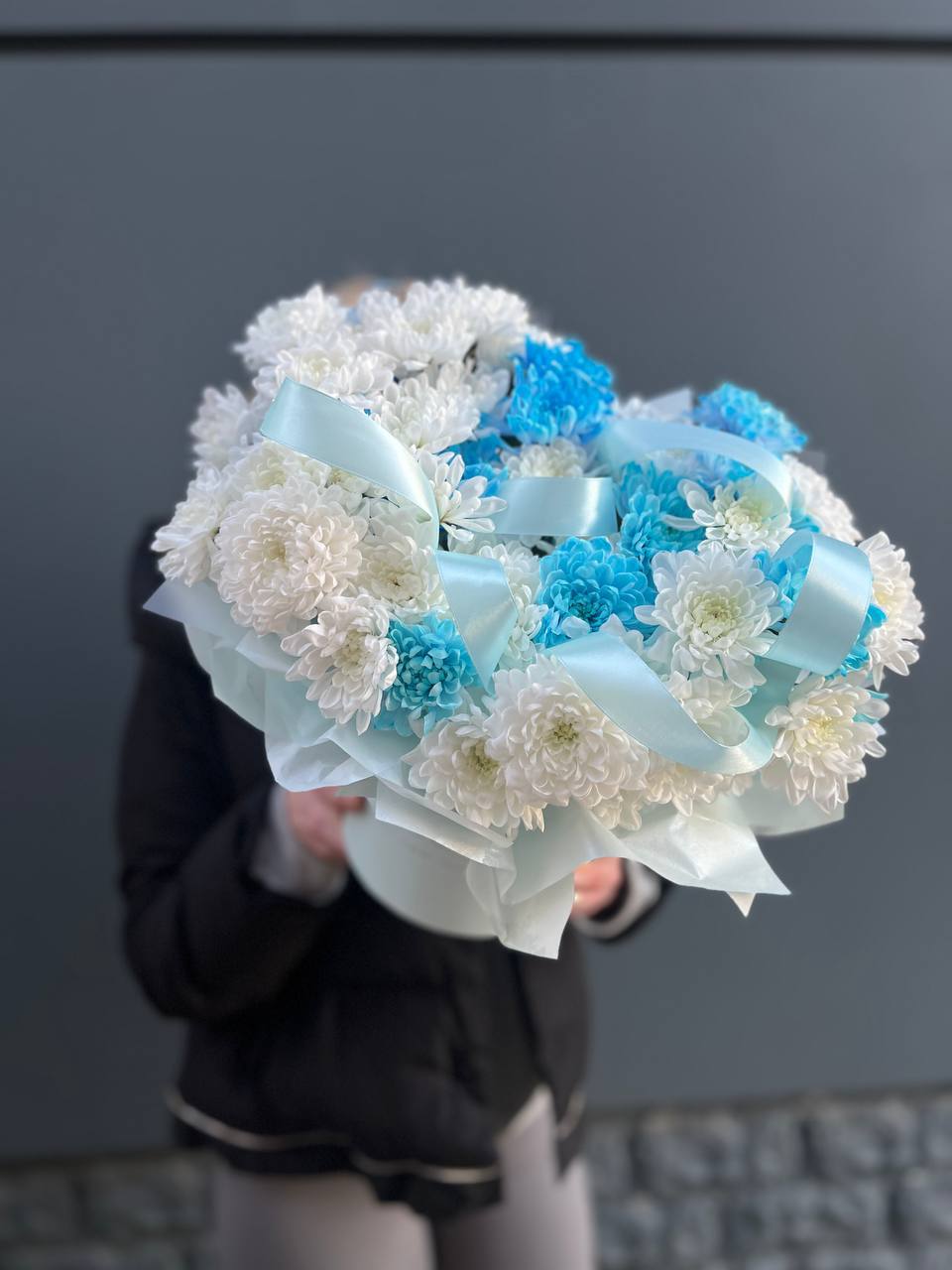 Пятнадцать веток кустовой хризантемы образуют пышное облако из множества соцветий. Каждая ветка раскрывается по-своему, создавая живую текстуру и объёмный силуэт букета.