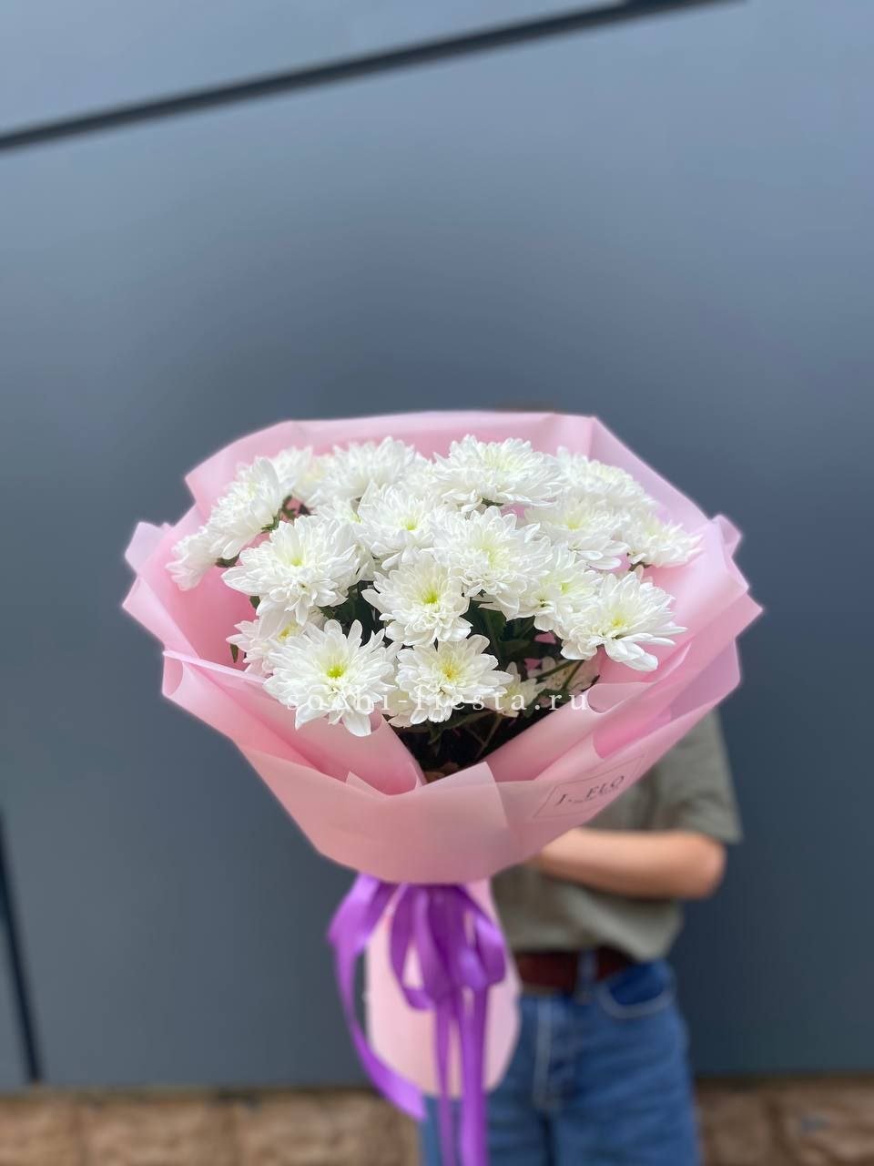 хризантема кустовая - 15 веток, лента, дизайнерская пленка.