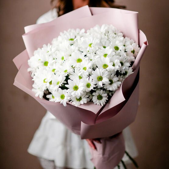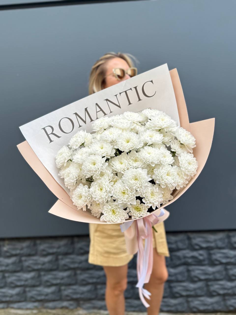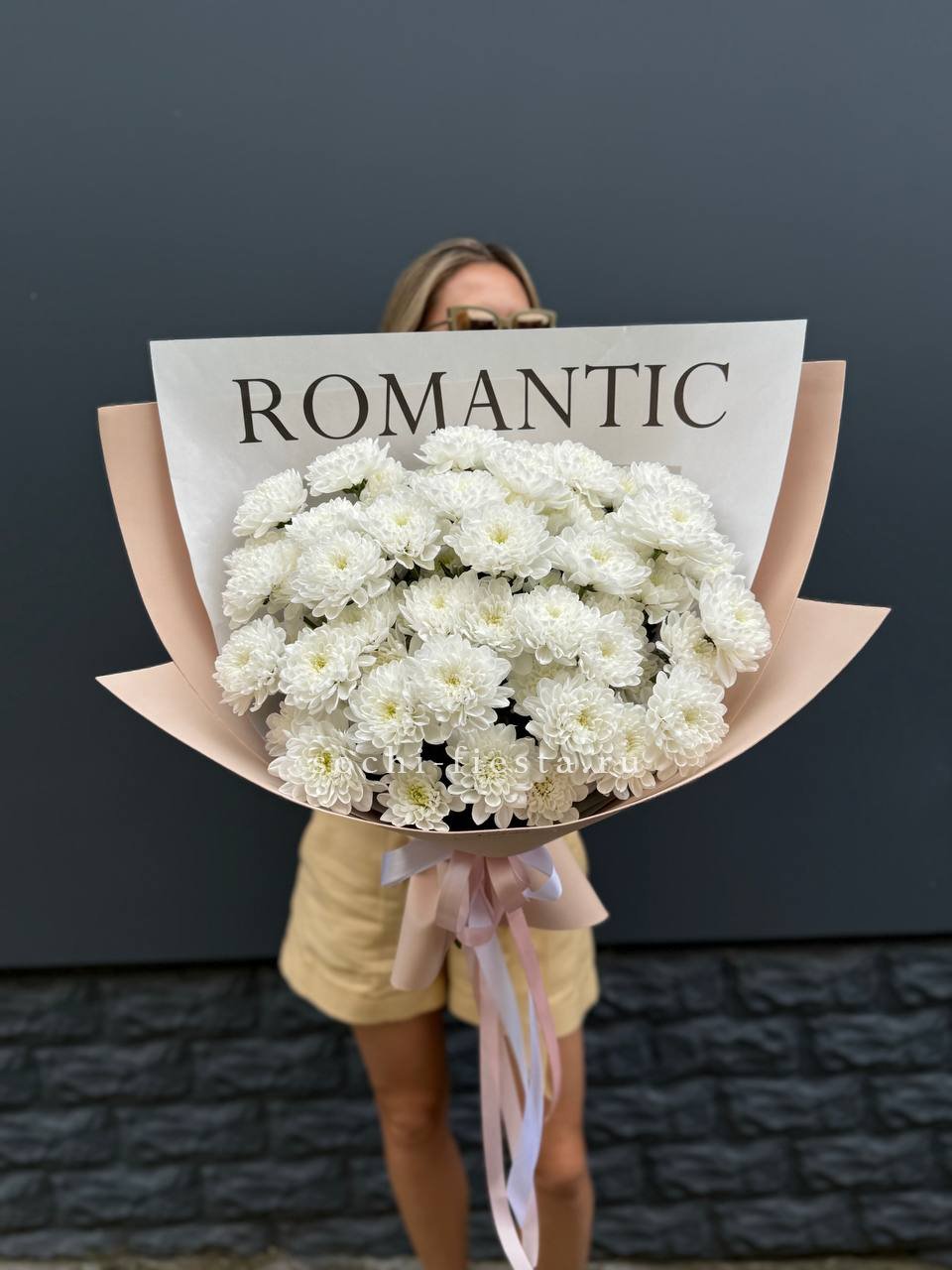 хризантема кустовая - 17 веток, тишью, дизайнерская упаковка, лента.
