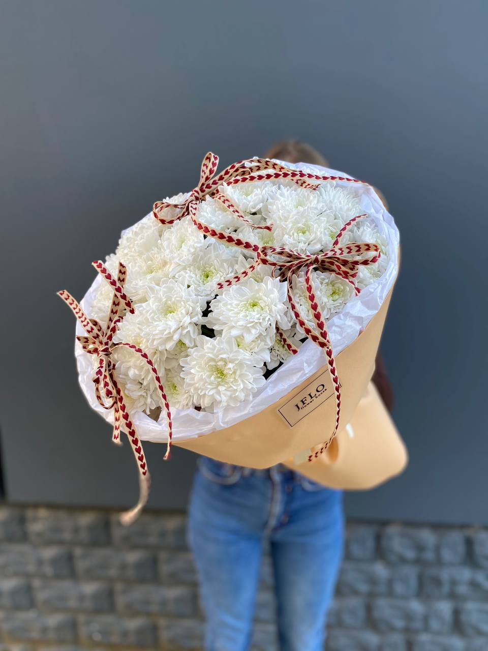 Семь хризантем собраны в плотную округлую форму и украшены бежевой упаковкой с тремя тонкими бантами. Сердечки на лентах добавляют композиции трогательности. Букет держит форму и выглядит аккуратно в руках или в вазе.