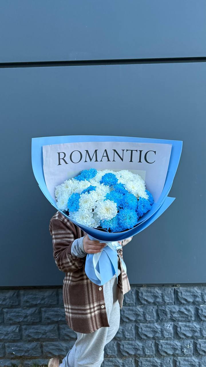 Контрастный микс из белоснежных и лазурных хризантем — идеальный способ сказать о самом важном. Лаконичный дизайн упаковки подчеркивает яркость цветов, а надпись Romantic говорит сама за себя. Подарите незабываемые эмоции и частичку нежности тому, кто вам дорог!