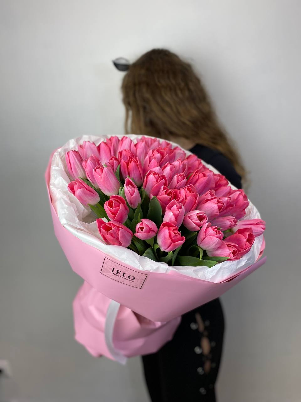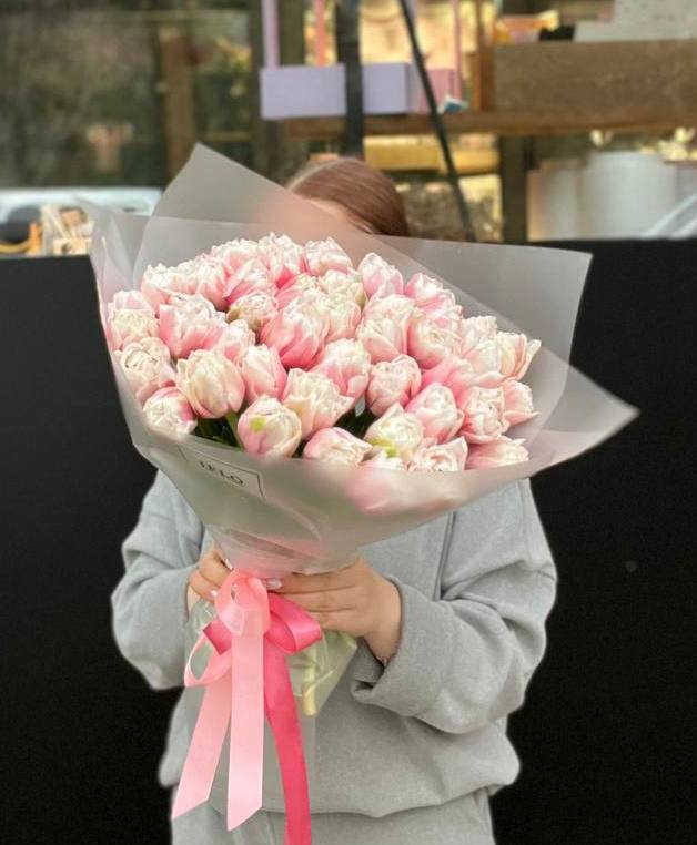 Пятьдесят один тюльпан собран в плотный монохромный букет с мягкими переливами пастельных оттенков. Матовая упаковка сохраняет свежесть бутонов и создает лаконичную форму. Весенняя композиция для тех моментов, когда хочется заполнить пространство цветом и светом.