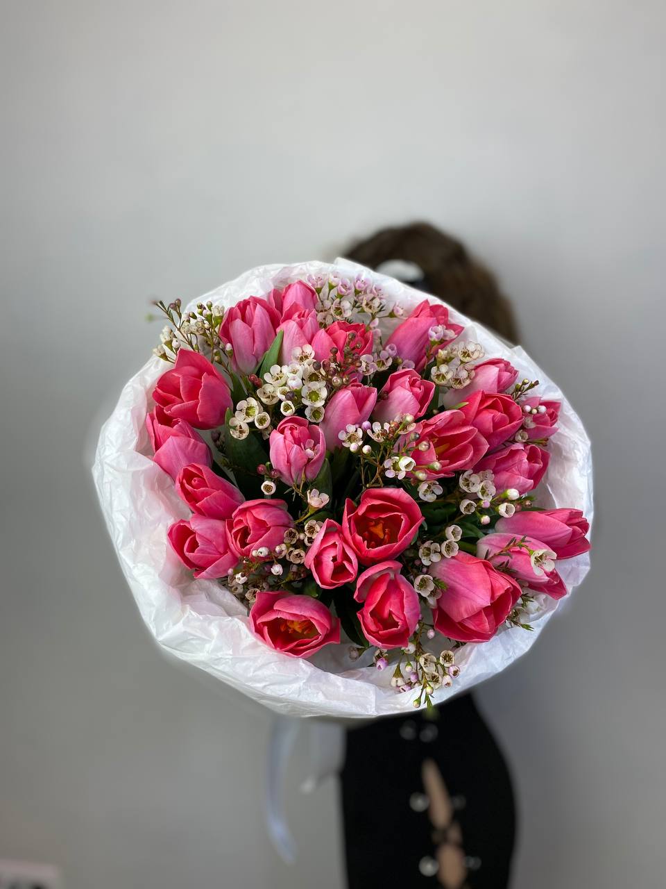 Два оттенка розового переплетаются в лаконичном весеннем дуэте. Тюльпаны с их гладкими бутонами дополнены воздушными соцветиями хамелациума.
