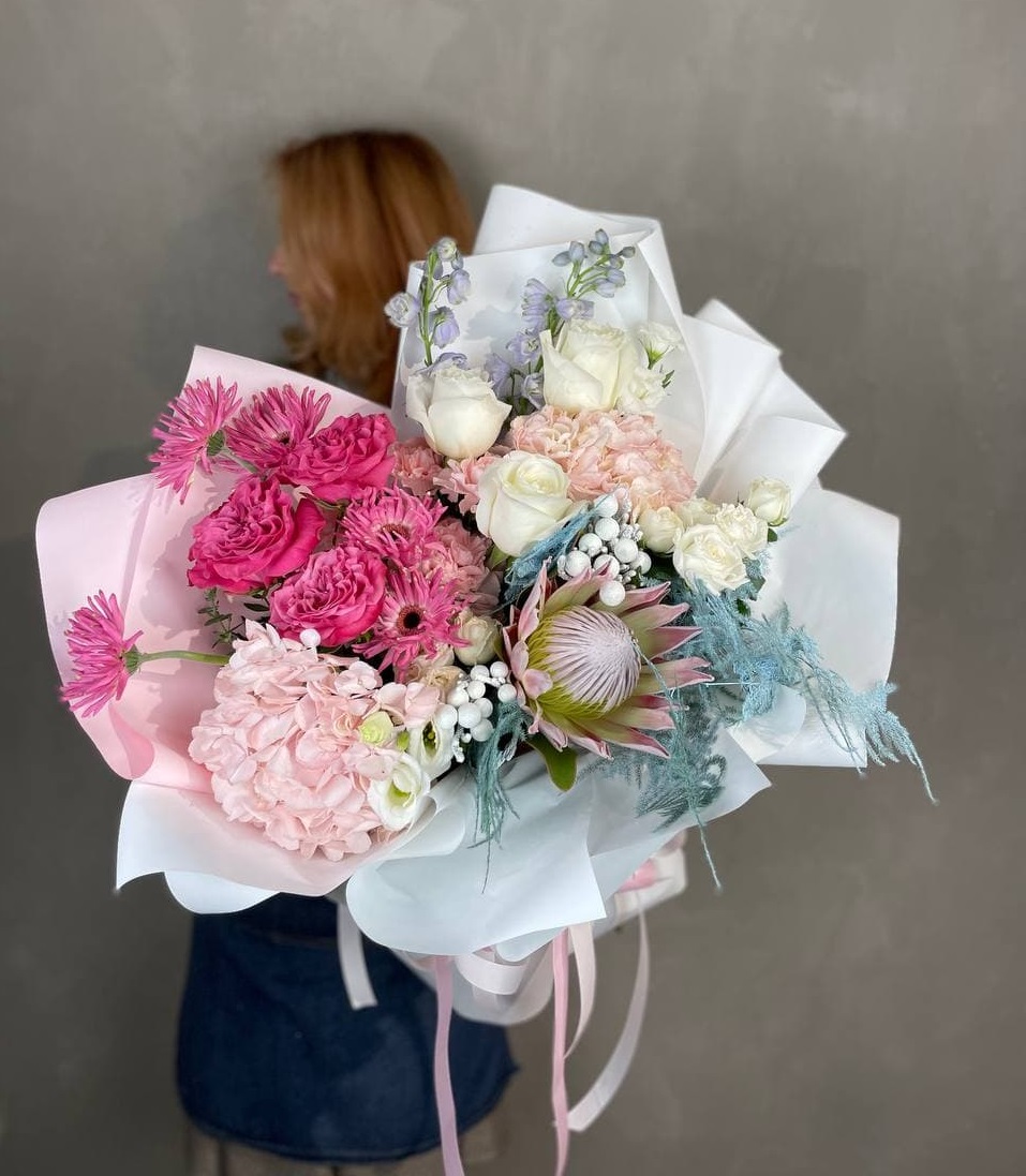 протея, роза кустовая, эустома, диантус, роза одноголовая, эвкалипт, озотамнус (по сезону) лента, дизайнерская упаковка.