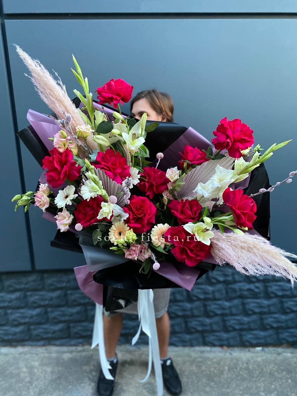 Вертикальные линии гладиолусов и пушистые метёлки пампасной травы задают динамику всей композиции. Красные розы и герберы переплетаются с белоснежными эустомами и лилиями, создавая многослойный объём. Авторская работа для тех, кто ценит выразительность формы.