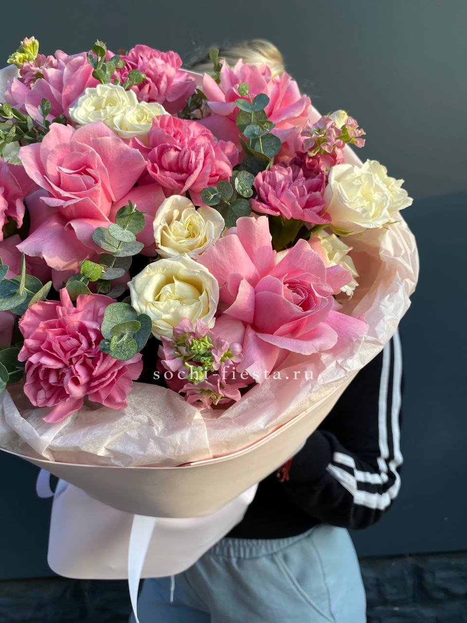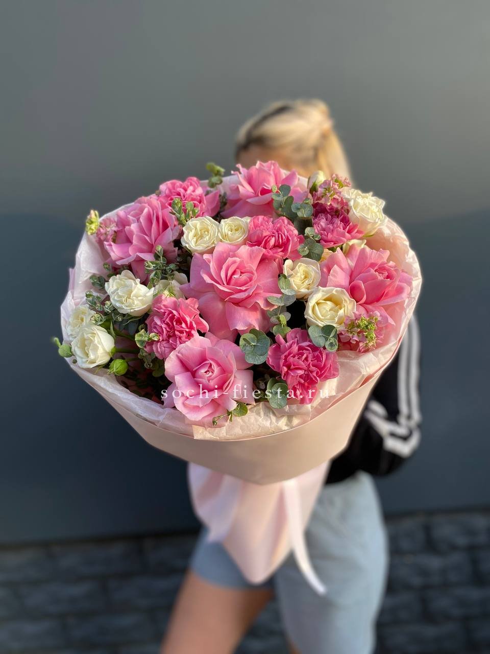 розы, пионовидные кустовые розы, диантусы, эвкалипт, лента, дизайнерская упаковка.