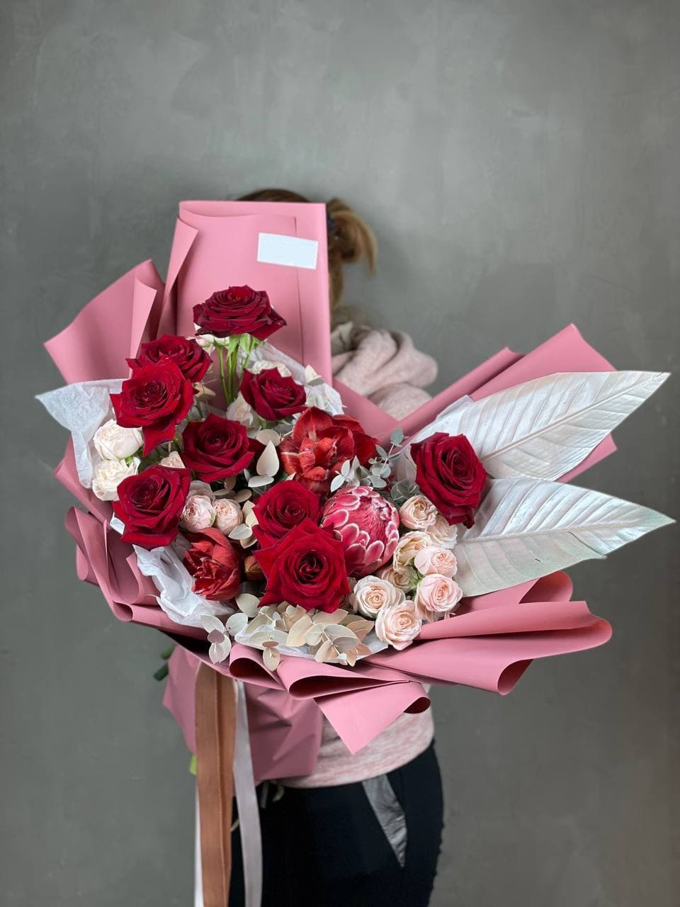 розы, кустовые пионовидные розы, амариллис (или аналог), протея, листья стрелиции, эвкалипт, дизайнерское оформление.