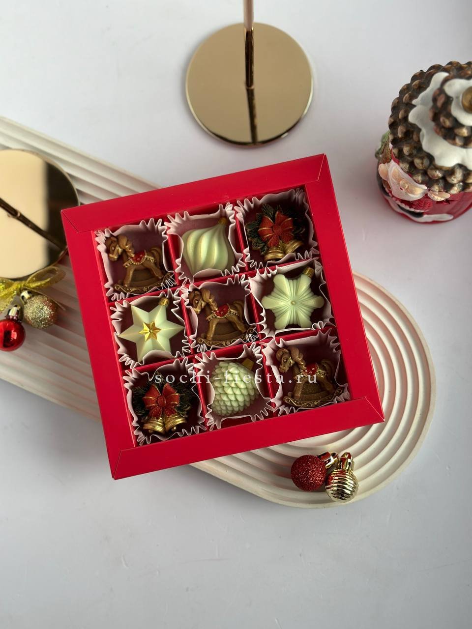 Девять шоколадных игрушек с ручной росписью: миниатюрные лошадки и колокольчики из бельгийского шоколада. Каждая фигурка прорисована вручную и готова украсить праздничный стол или стать частью новогоднего настроения.