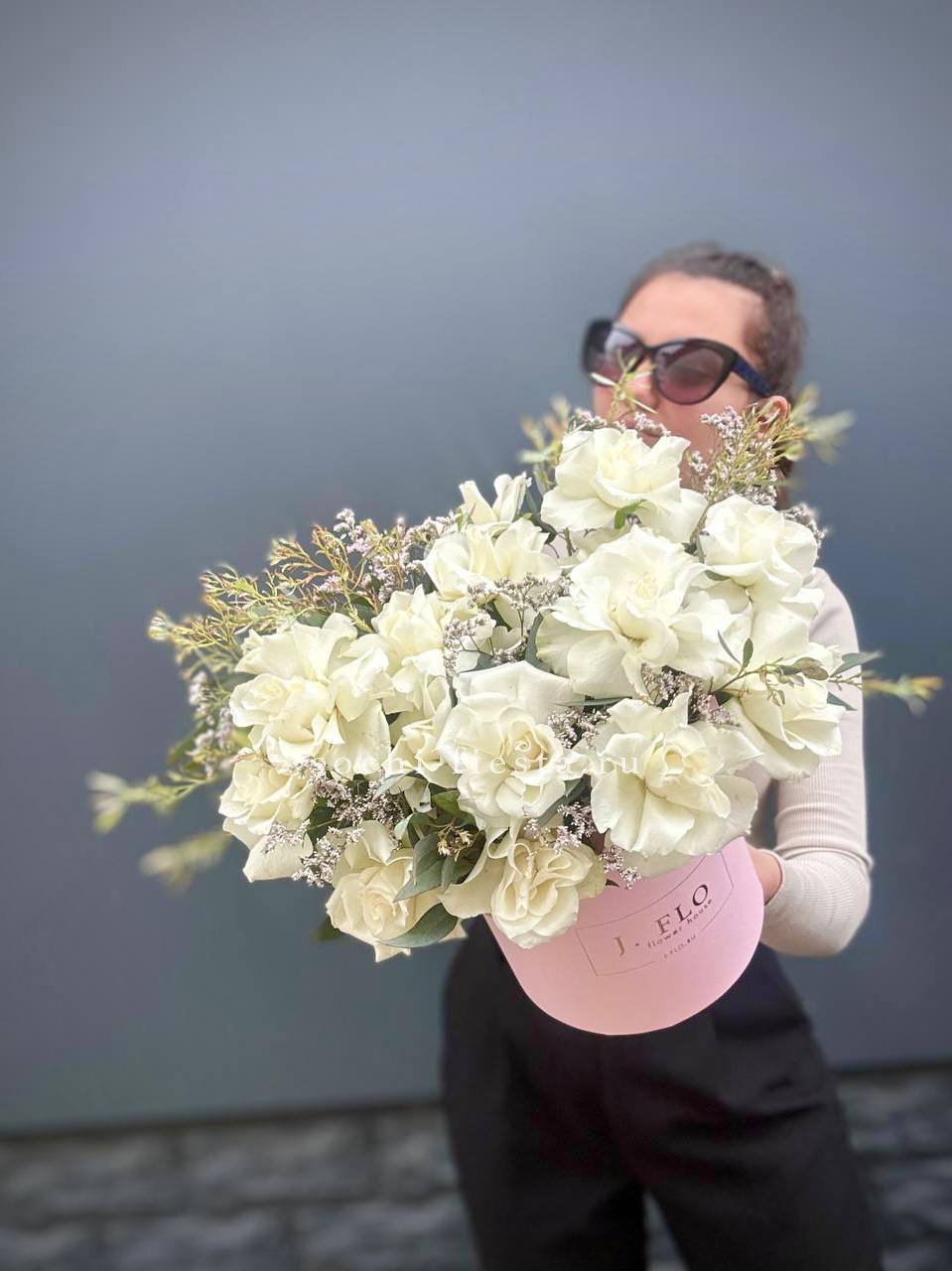 Белые французские розы раскрываются крупными бутонами и соседствуют с воздушной эустомой. Композиция создает ощущение легкости и света.
