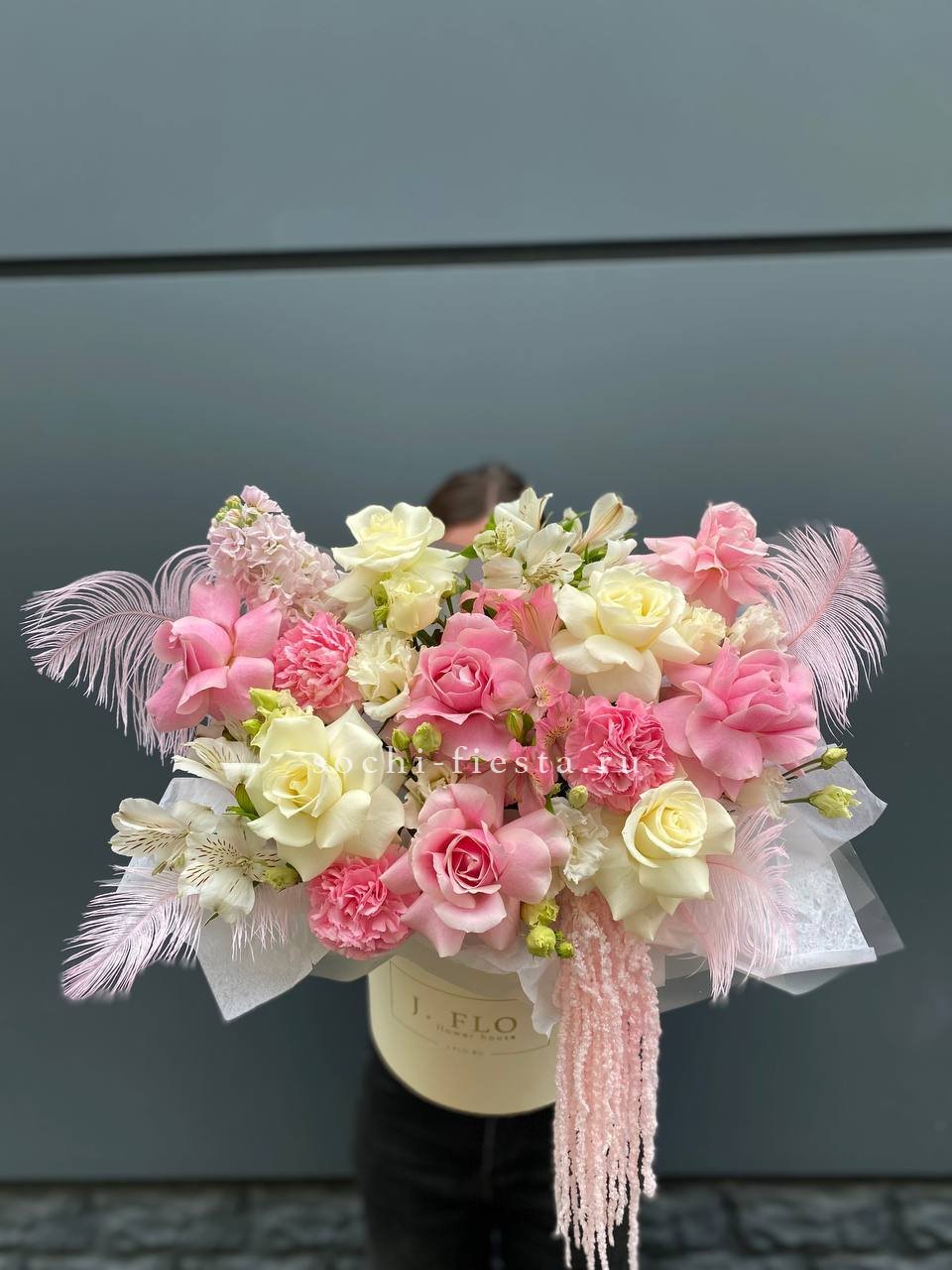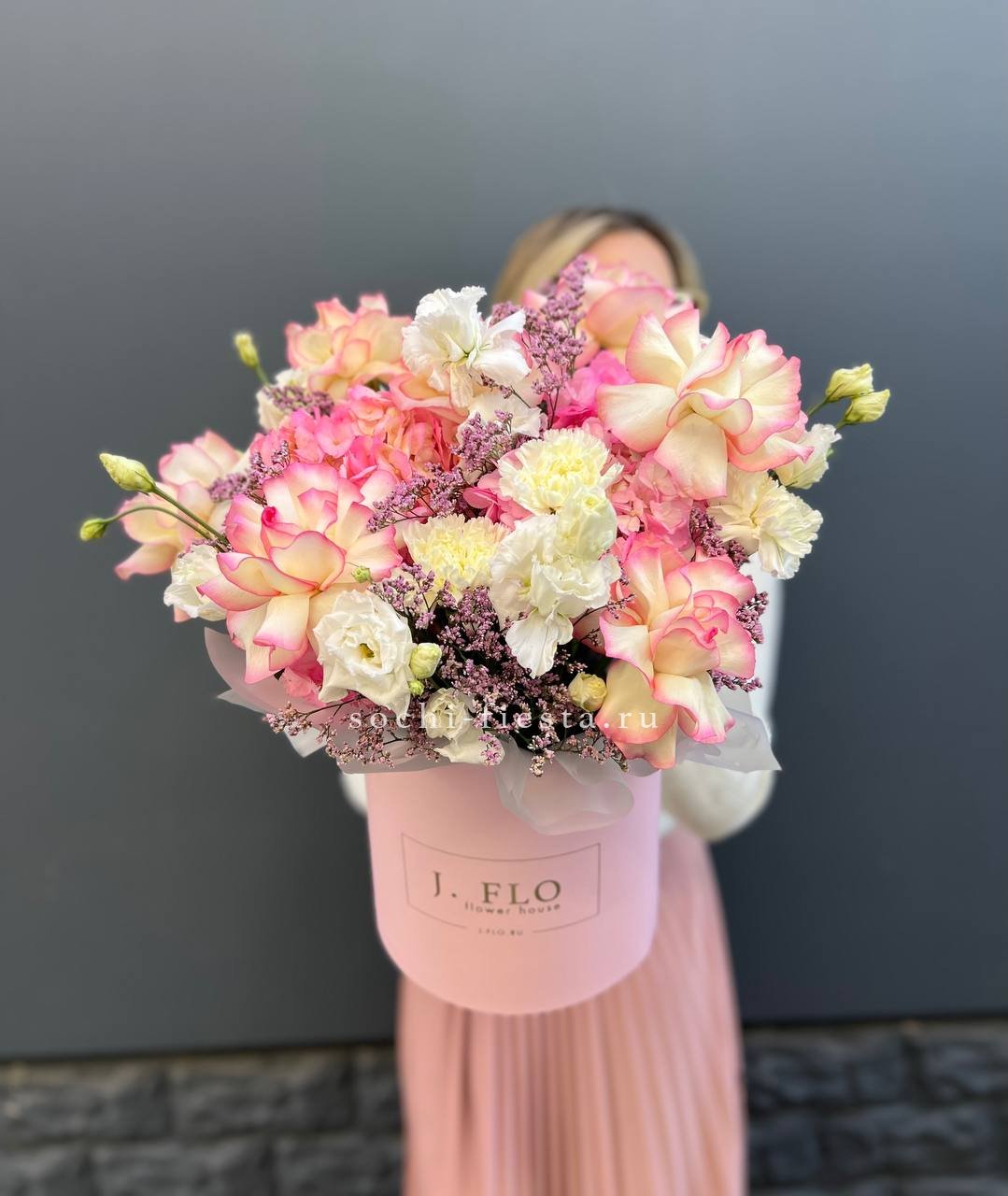 пион, розы одноголовые, гортензия, пионовидная роза, эвкалипт, тишью, коробка D13 Цвет коробки может быть согласован с заказчиком.