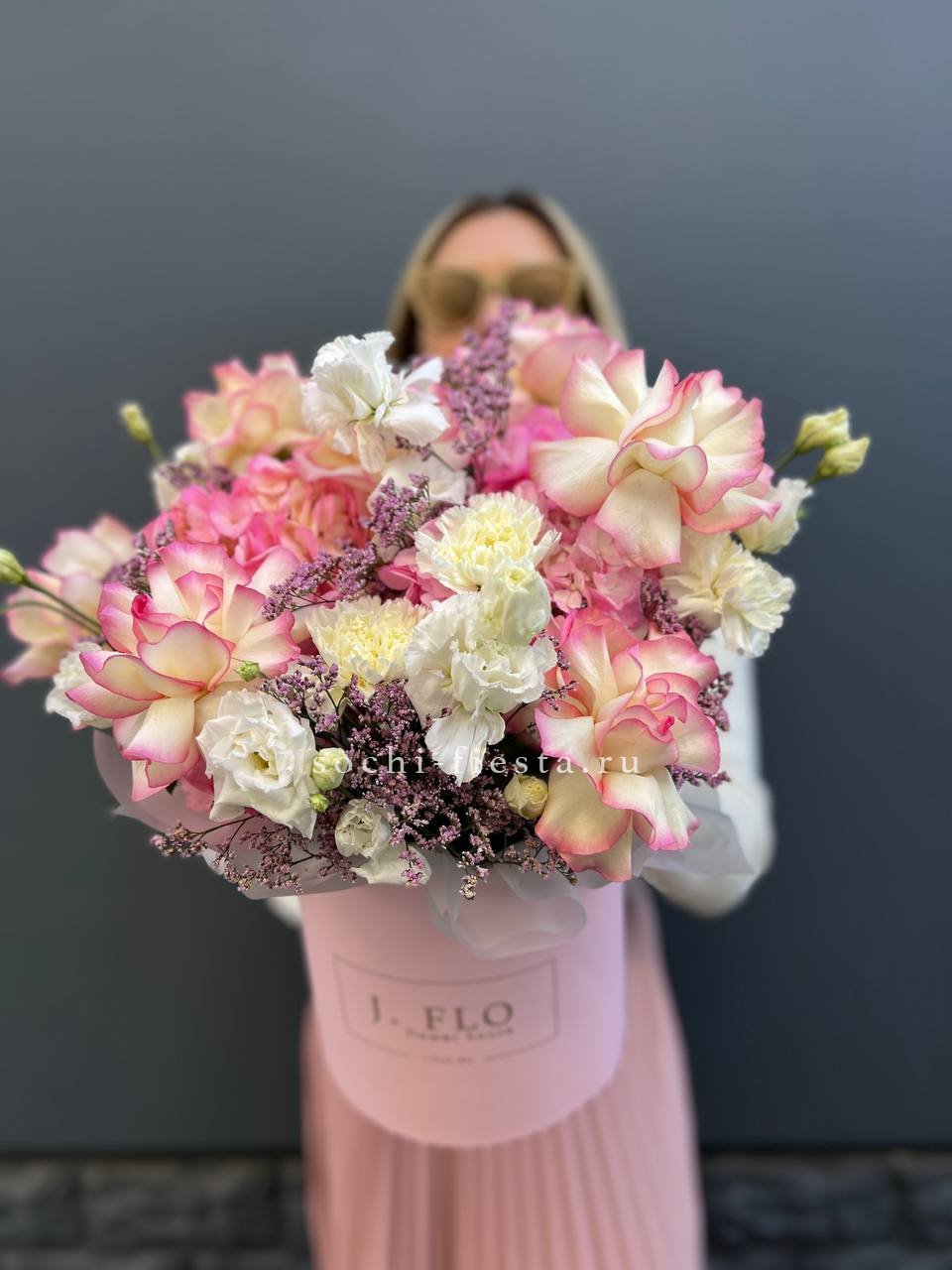 Компактная композиция в круглой коробке объединяет пышные пионы, махровые розы и воздушную гортензию. Плотная сборка позволяет разместить бокс на небольшом столе или полке. Веточки эвкалипта добавляют свежести и завершают форму.