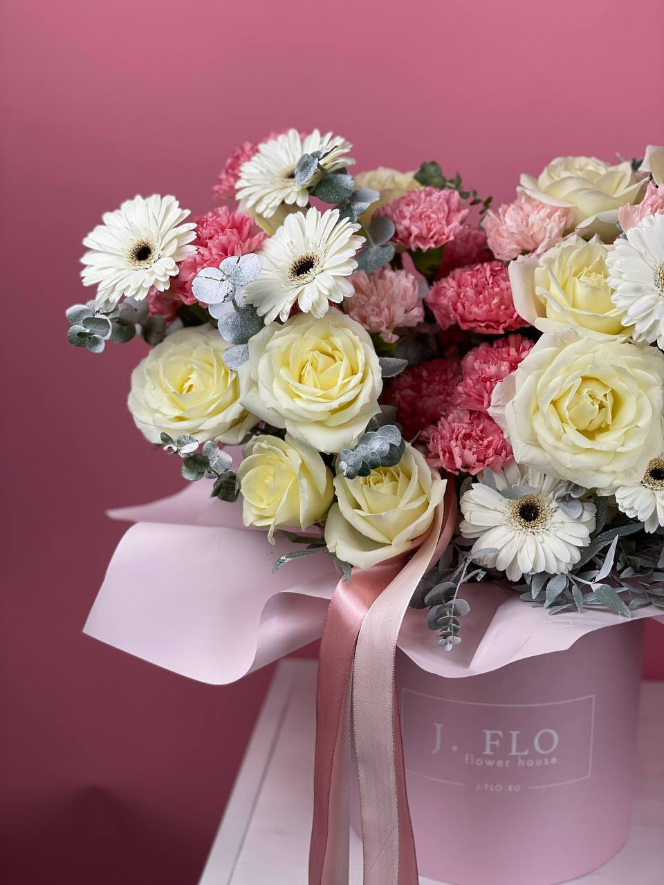 Двадцать семь бархатных роз собраны в плотную круглую композицию с серебристыми ветками эвкалипта. Шляпная коробка сохраняет свежесть и позволяет разместить цветы в любом уголке дома.