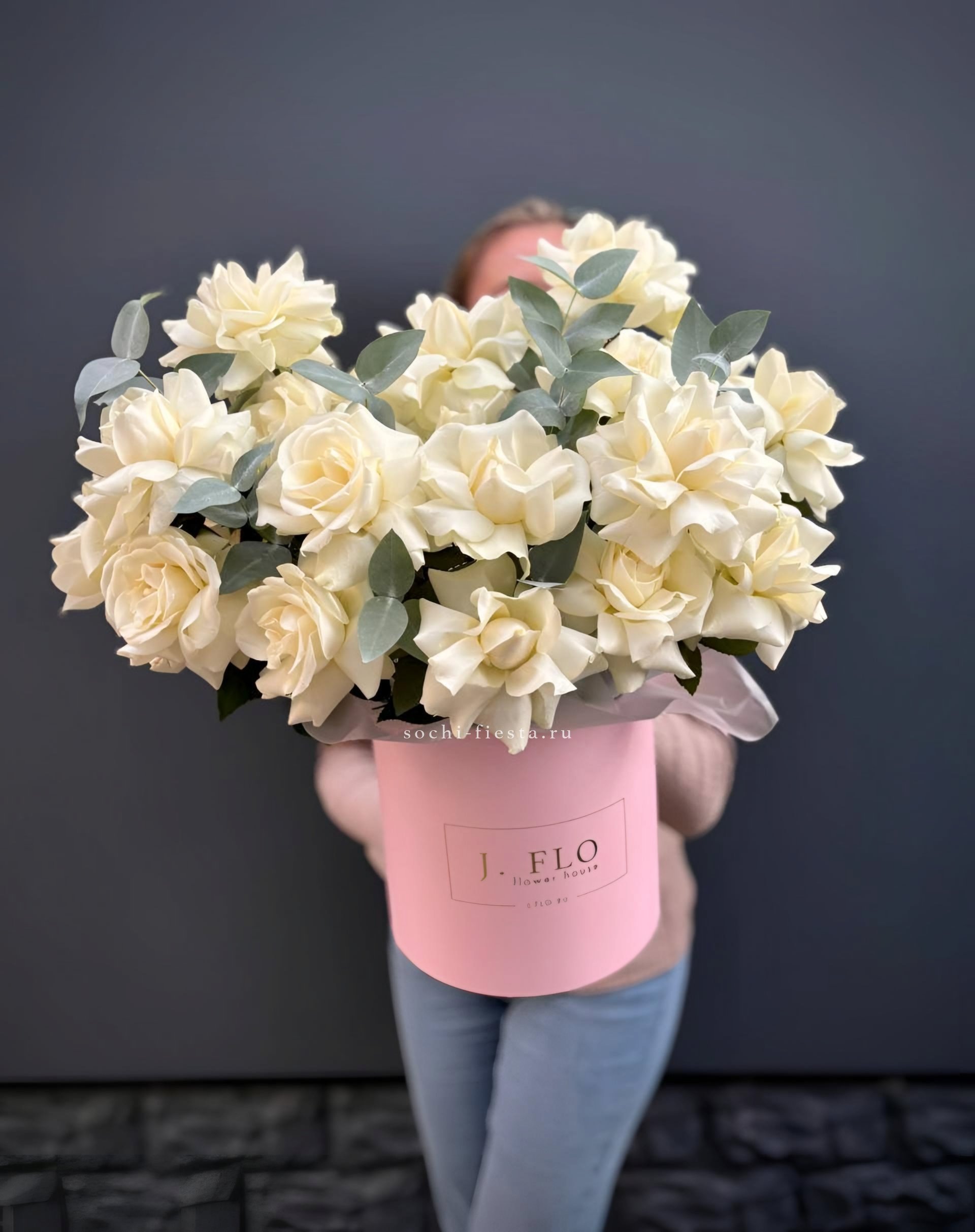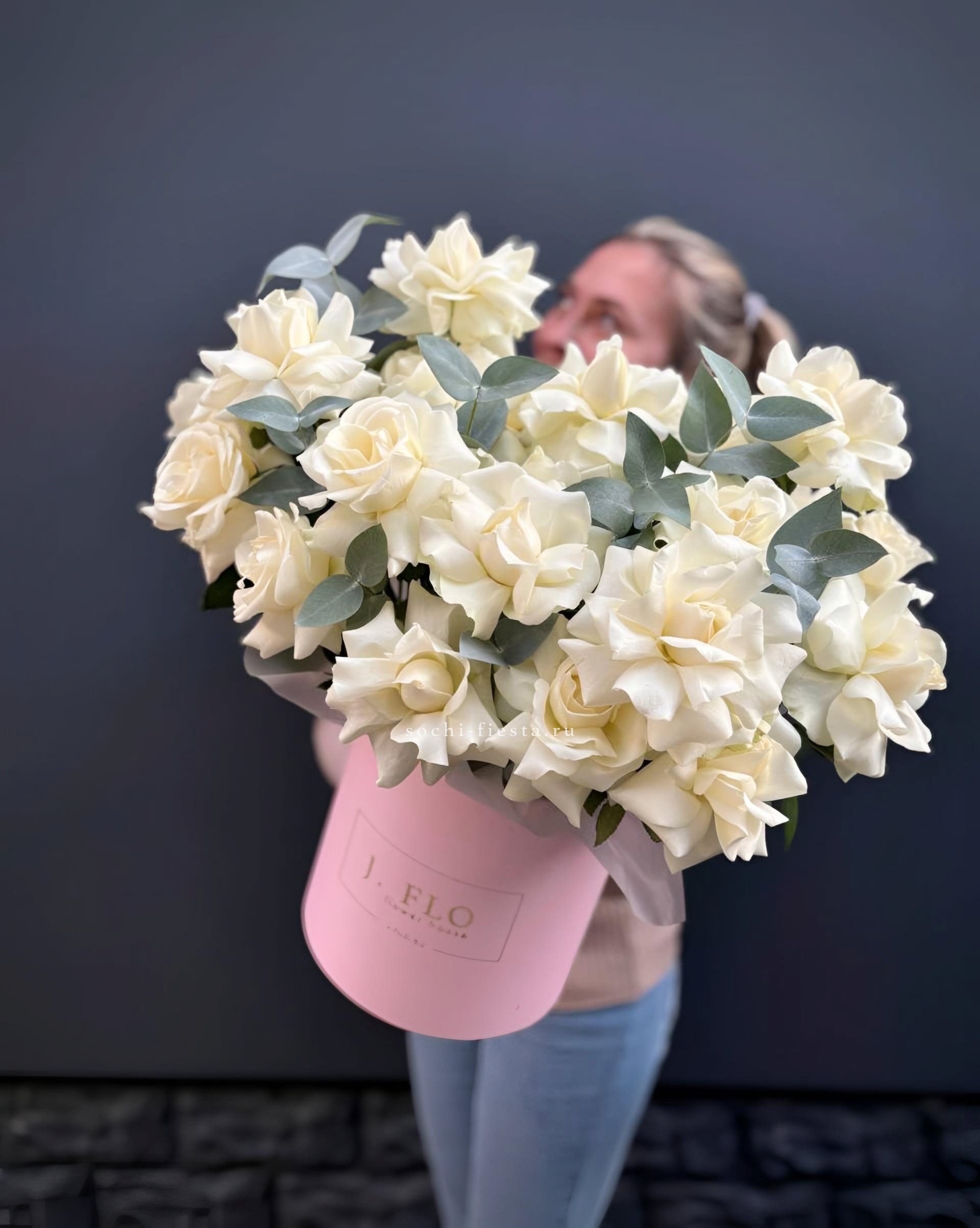 эустома, пионовидная кустовая роза, белая роза, хлопок, эвкалипт, бокс 13.