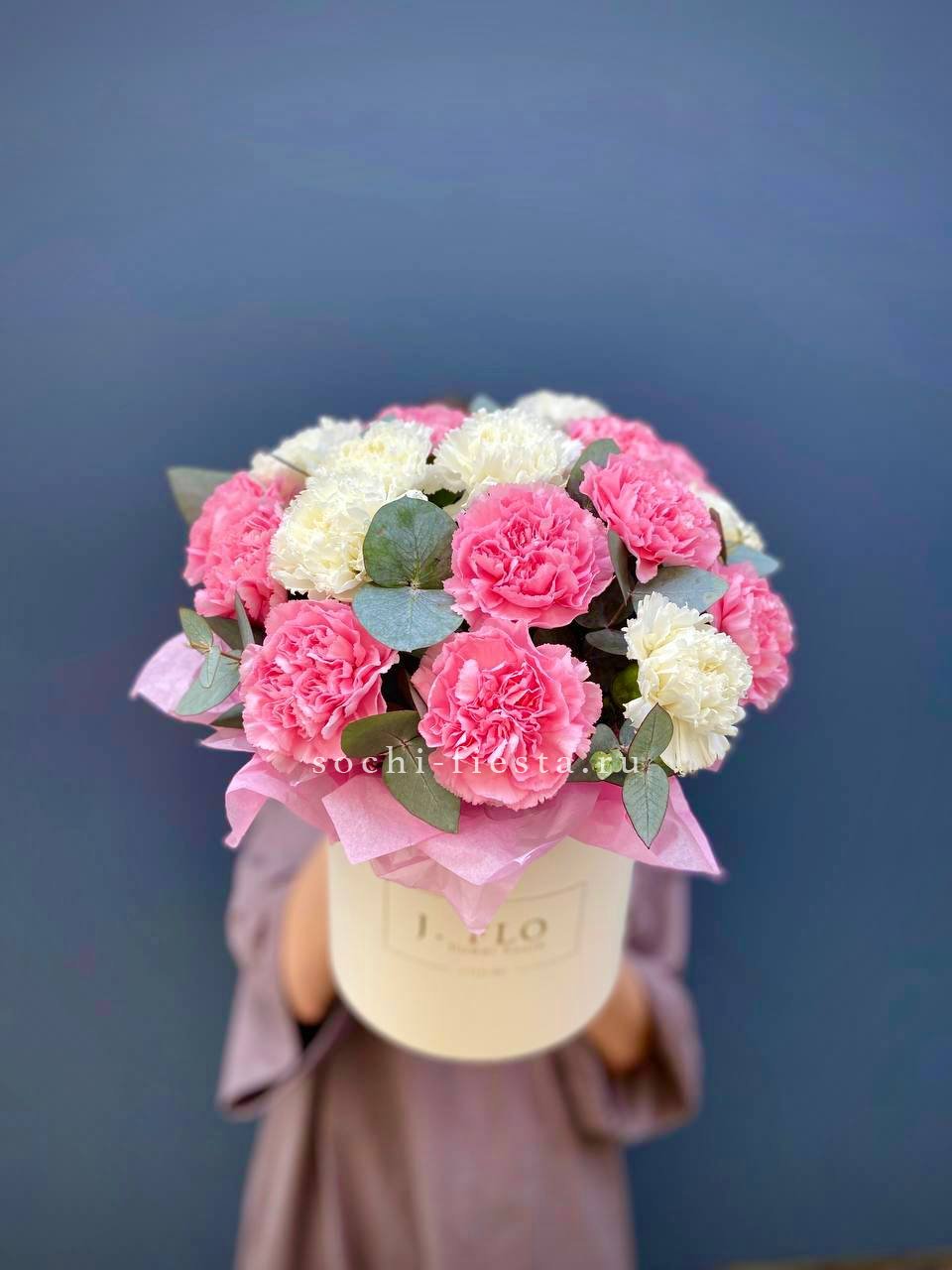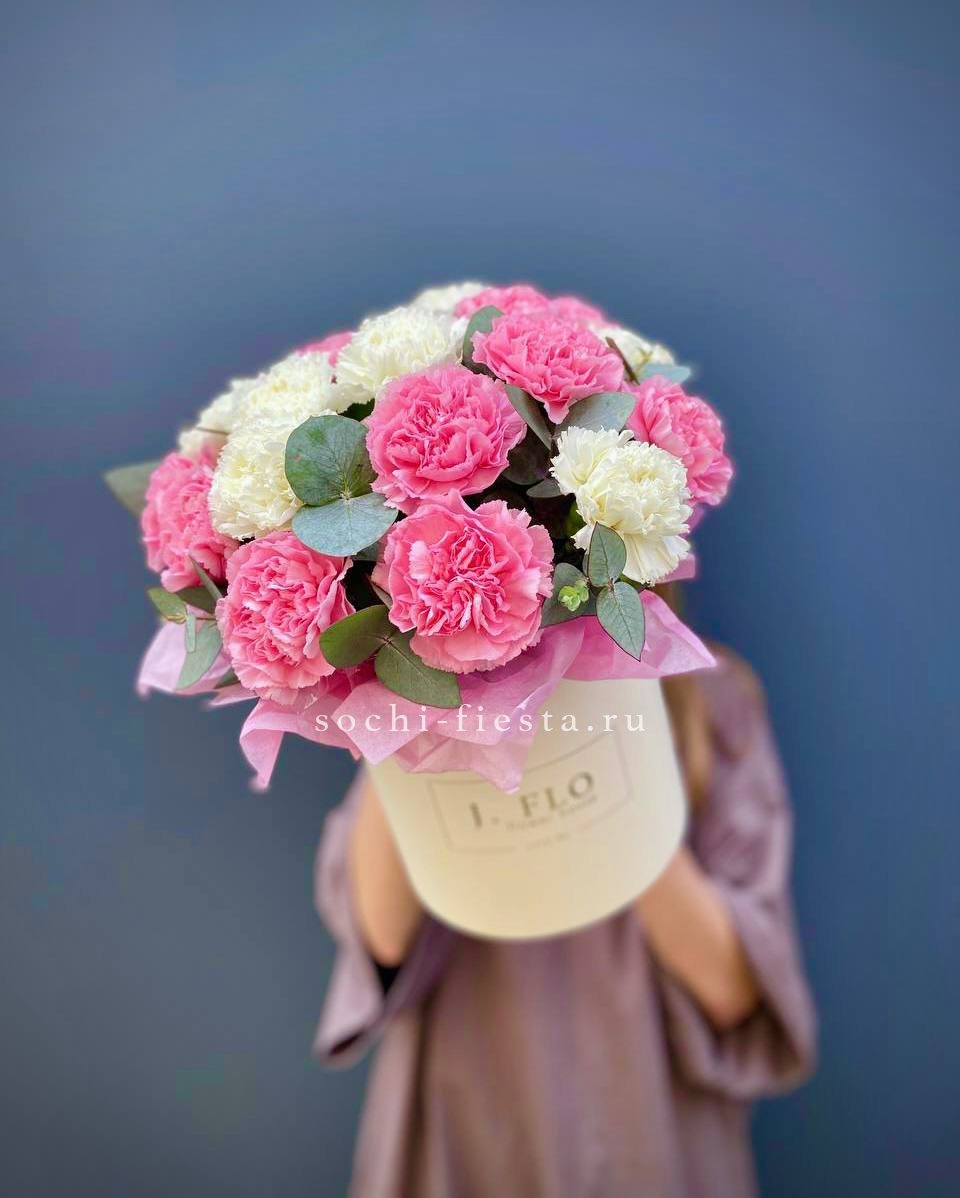 красная и розовая роза, озатамус, диантус, мисти баблс, эвкалипт, бокс 20.