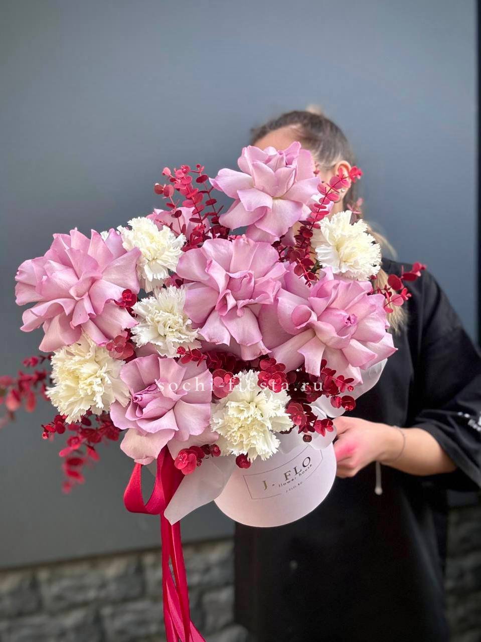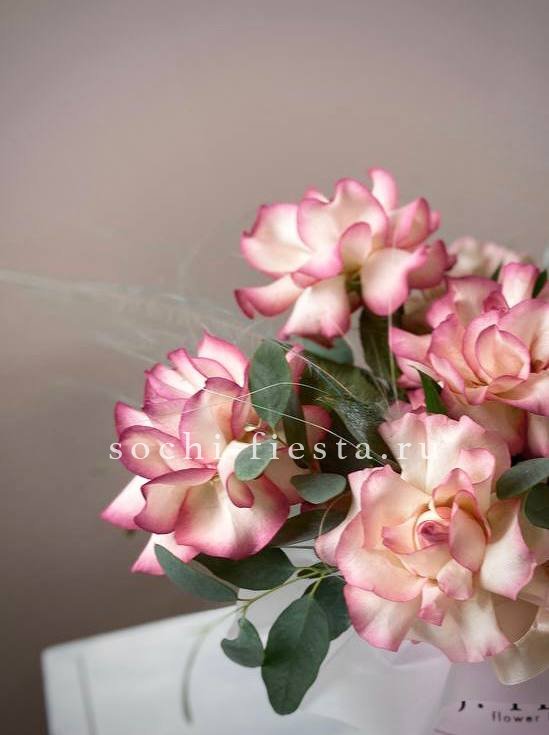 Французские розы цвета утренней зари дополнены воздушными соцветиями диантуса. Эвкалипт добавляет серебристые ноты и завершает округлую форму бокса.