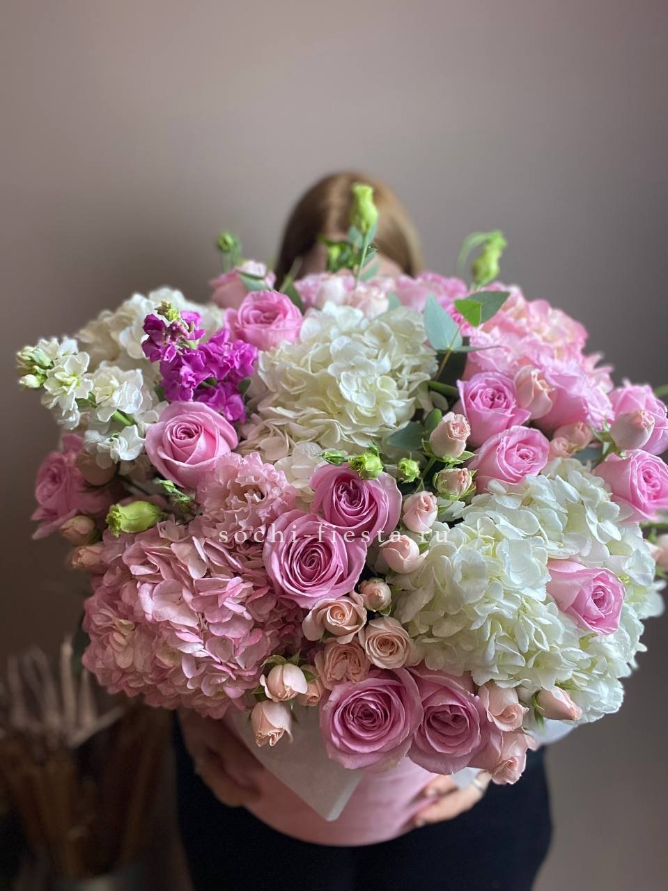 Объемная композиция занимает пространство уверенно и выразительно. Розово-белая гамма плавно перетекает от одного оттенка к другому. Крупный формат позволяет раскрыть всю красоту каждого цветка.