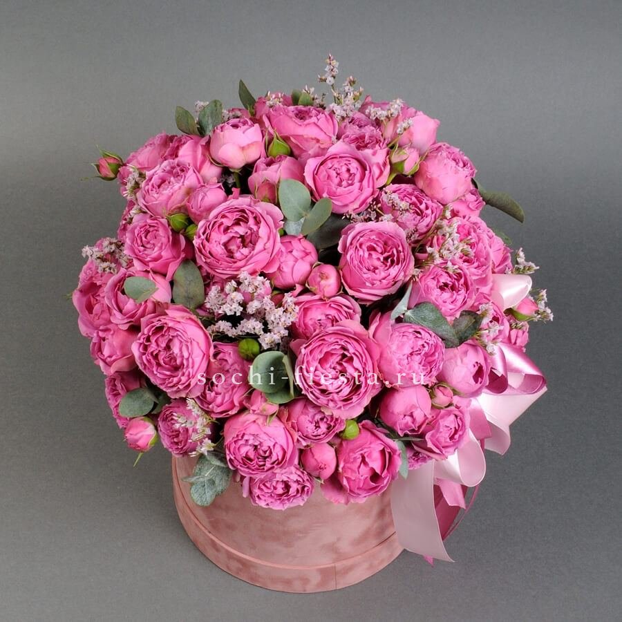 Пионовидные кустовые розы собраны плотно, создавая объёмную композицию с живой текстурой. Лимониум и эвкалипт добавляют воздушности, а цилиндр собирает всё в компактную форму.