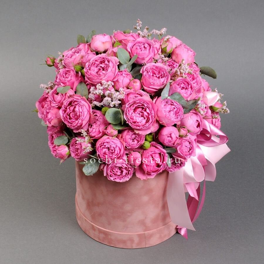 пионовидные кустовые розы, эвкалипт, лимониум, зелень, лента, цилиндр D16.