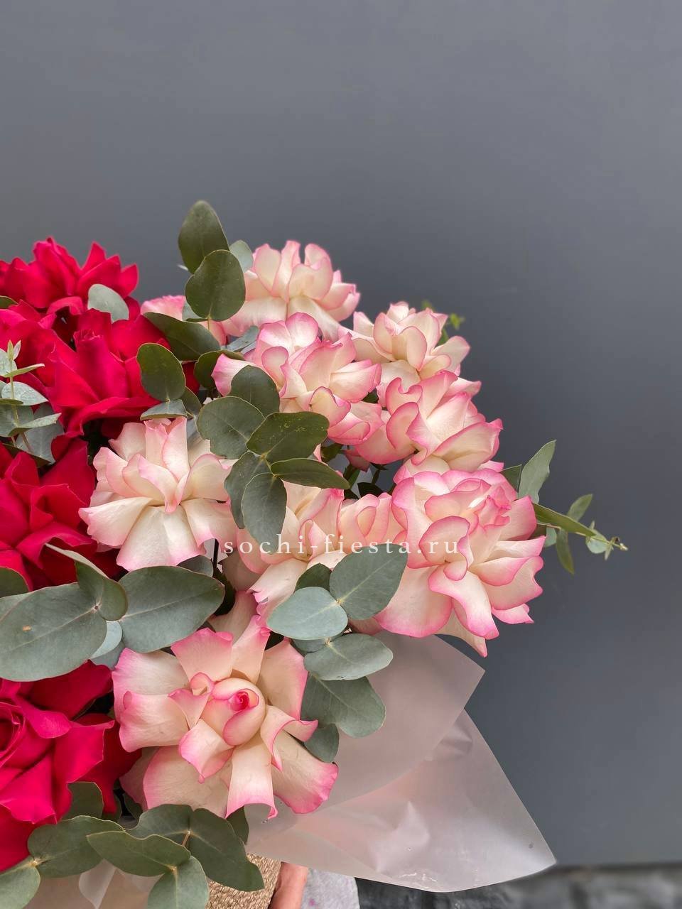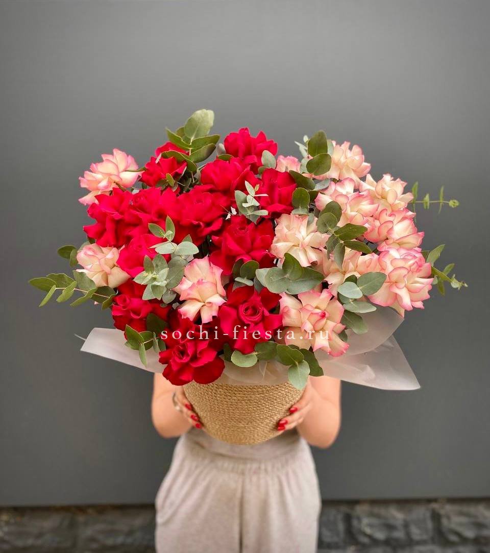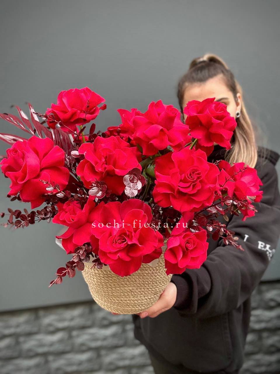 красная роза, бомбастик, лагурус, золотой эвкалипт, джутовое кашпо.