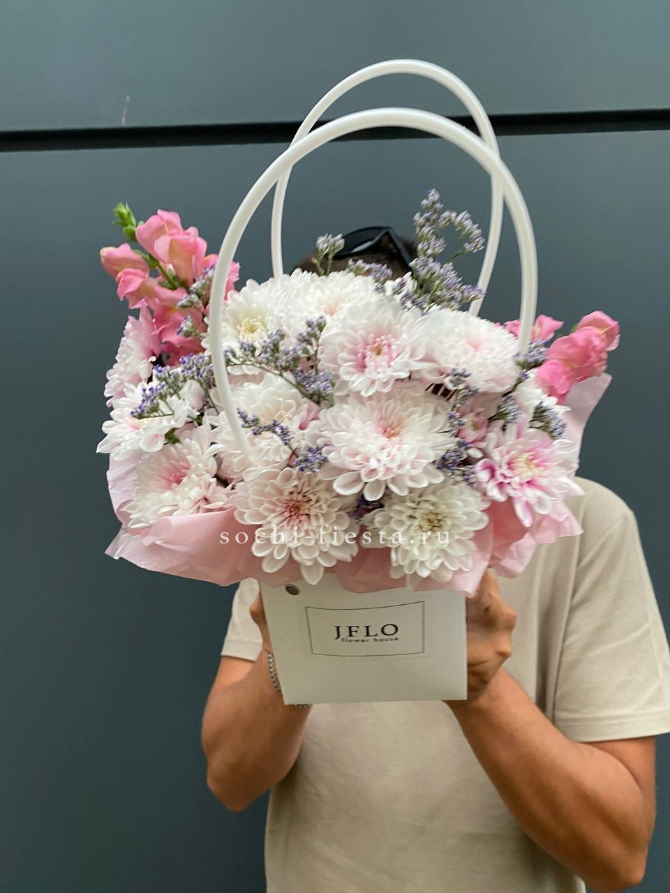 герберы, диантусы, альстромерии,  лента, эвкалипт,  сумка-кашпо.