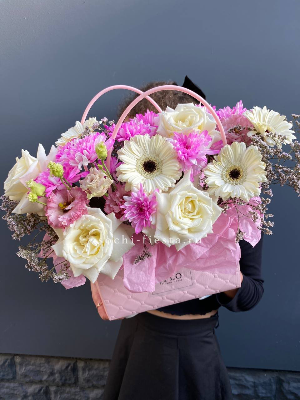 Герберы задают ритм композиции яркими пятнами среди белых роз и кустовой хризантемы. Лимониум заполняет объём воздушной текстурой. Сумка-кашпо удерживает форму и позволяет поставить букет без дополнительной вазы.