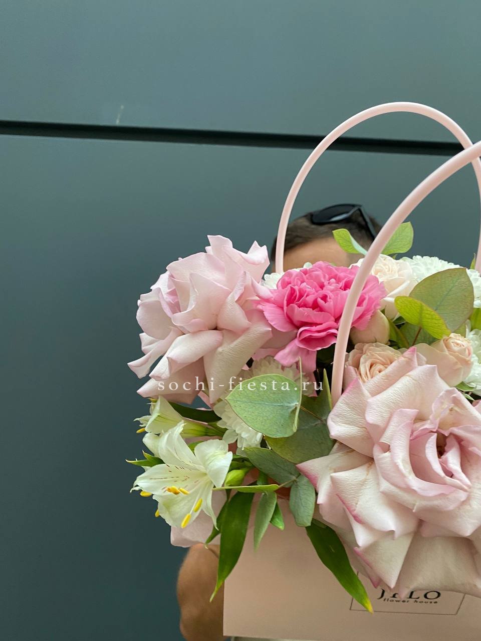 Розовые розы и диантусы переплетаются с кустовыми хризантемами в плотной округлой композиции. Альстромерия добавляет графичные акценты между бутонами. Сумочка собирает все элементы в аккуратную форму с естественным объёмом.