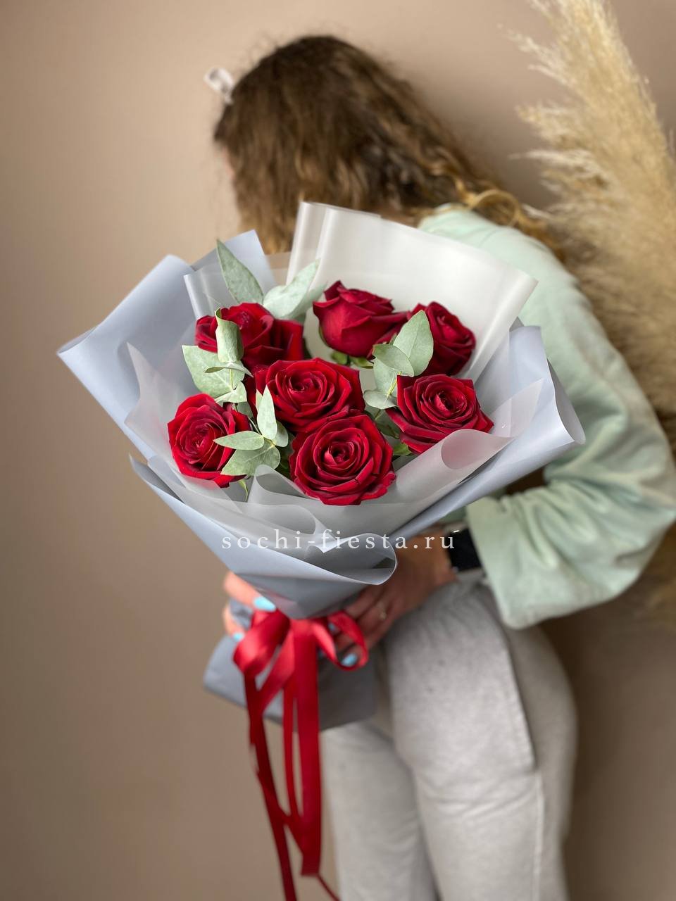 7 красных роз, эвкалипт, упаковка, лента. Данная цена доступна при единовременном заказе от 10 шт.