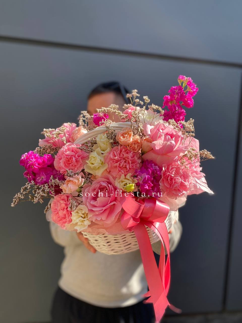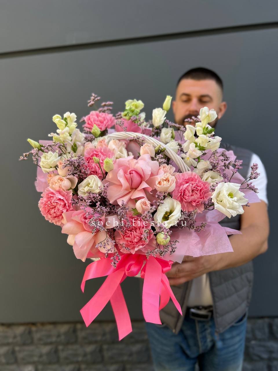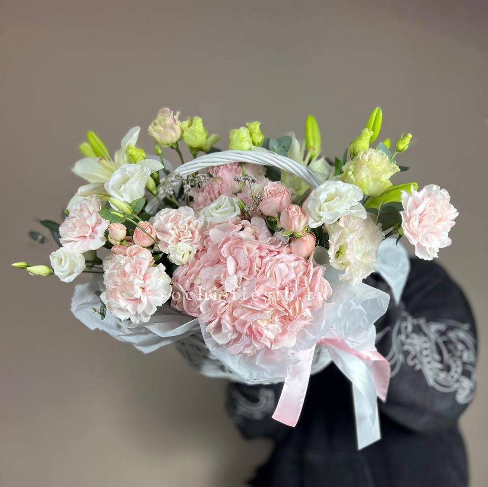 Корзина объединяет гортензии, эустомы, розы и маттиолу в многослойную композицию. Разные фактуры лепестков создают визуальную глубину и насыщенность.