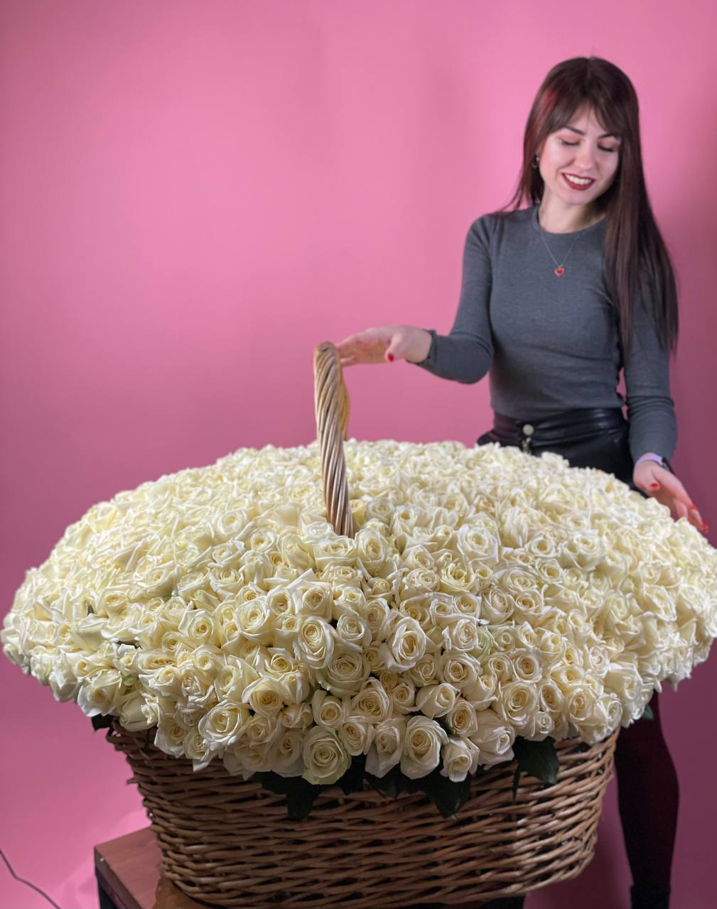 розы, эустома, гортензия, бомбастик, маттиола ( или аналог), эвкалипт, корзина.