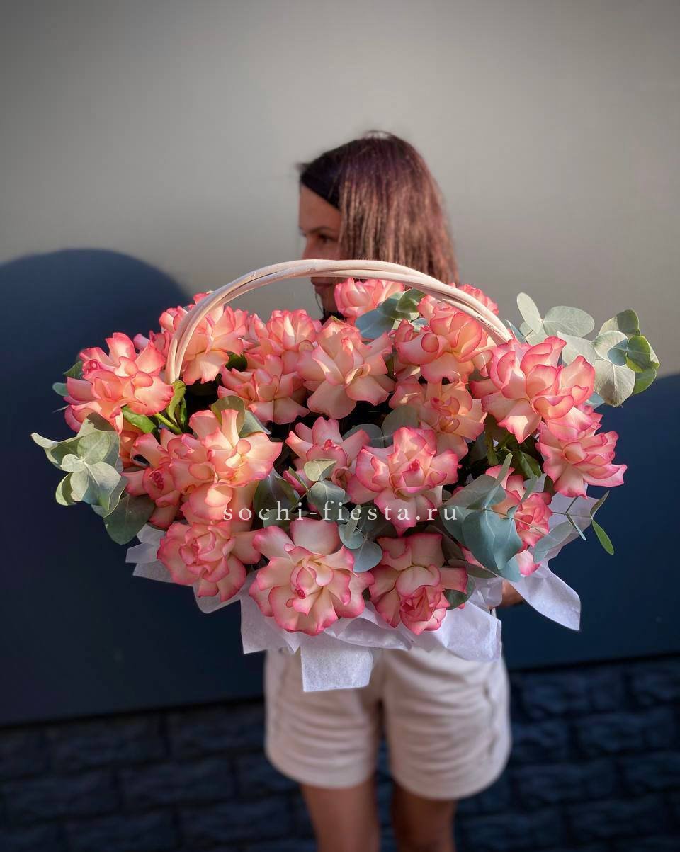 роза розовая французские - 25шт, эвкалипт, корзина.