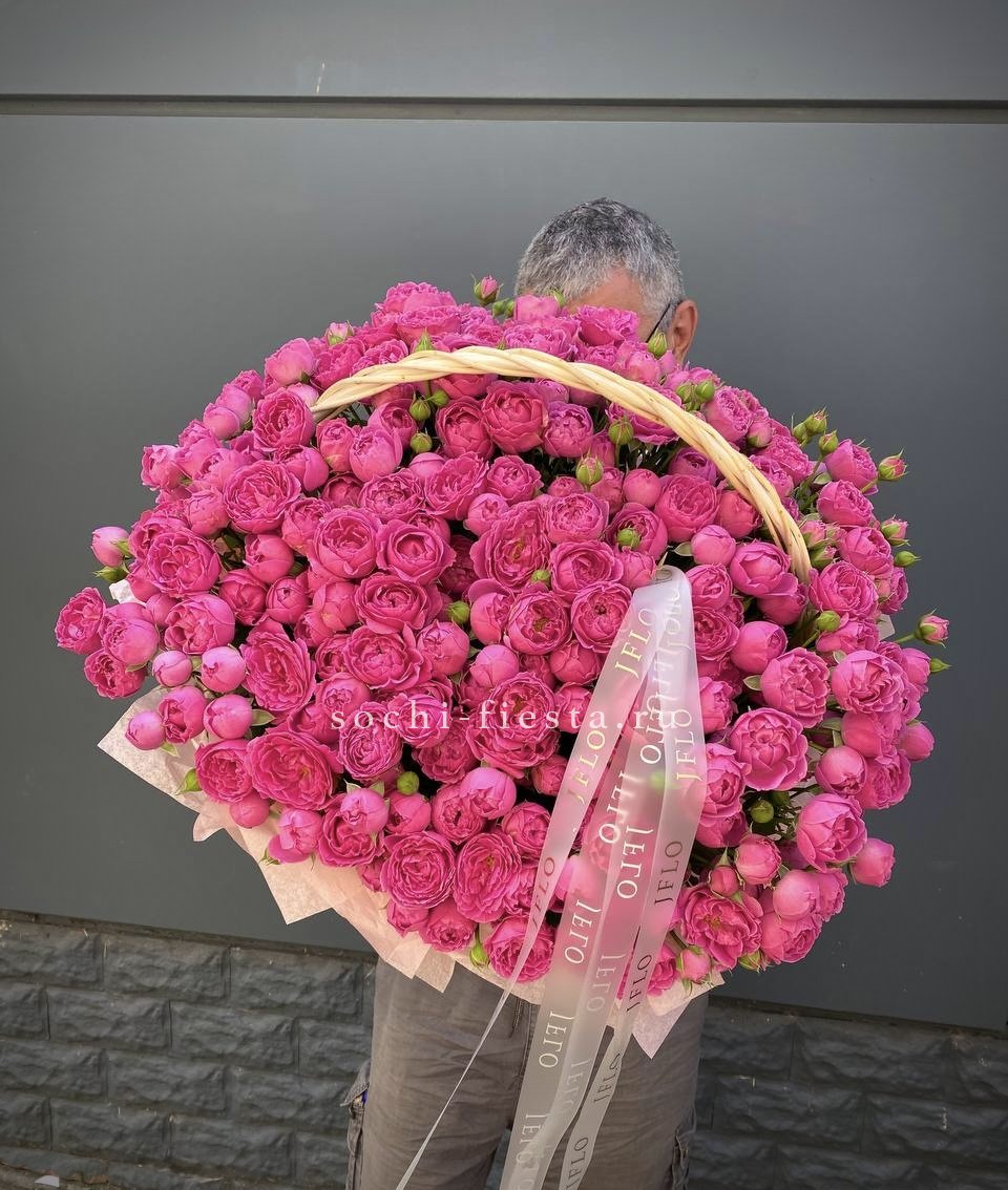 диантус, роза кустовая, гипсофила, гортензия, дельфиниум/львиный зев/маттиола (замена вне сезона), белая роза, георгины или аналог, эвкалипт, оазис, корзина D 25, двойной бант Состав композиции может быть незначительно изменен флористом в процессе изготовления с соблюдением стилистики, фактуры и цветовой гаммы оригинала.