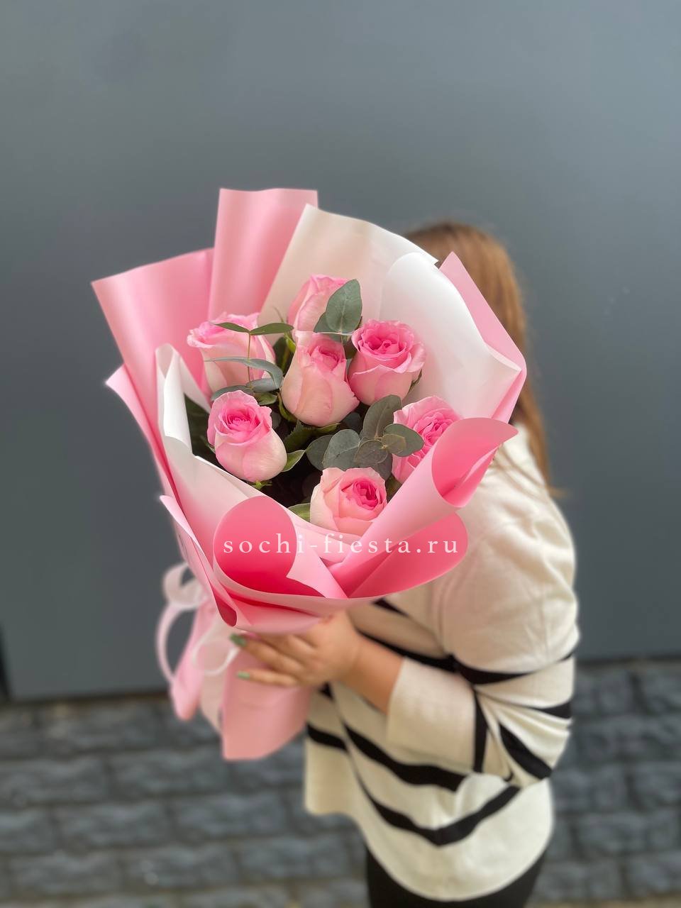 Семь пионовидных роз образуют компактный букет с мягкими линиями и спокойным ритмом. Ветви эвкалипта добавляют воздушности и завершают композицию.