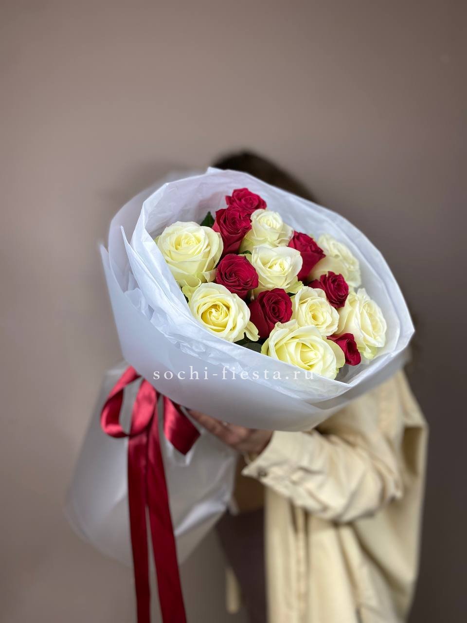 белые и красные розы микс в нежном оформлении.