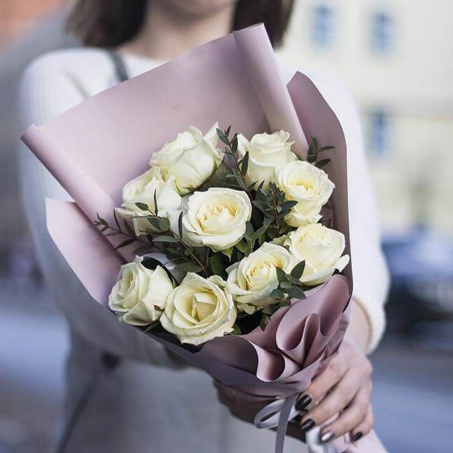 Пятнадцать белоснежных роз собраны в аккуратную форму с ровным силуэтом. Композиция сохраняет свежесть и держит структуру благодаря продуманному размещению бутонов в цилиндре.
