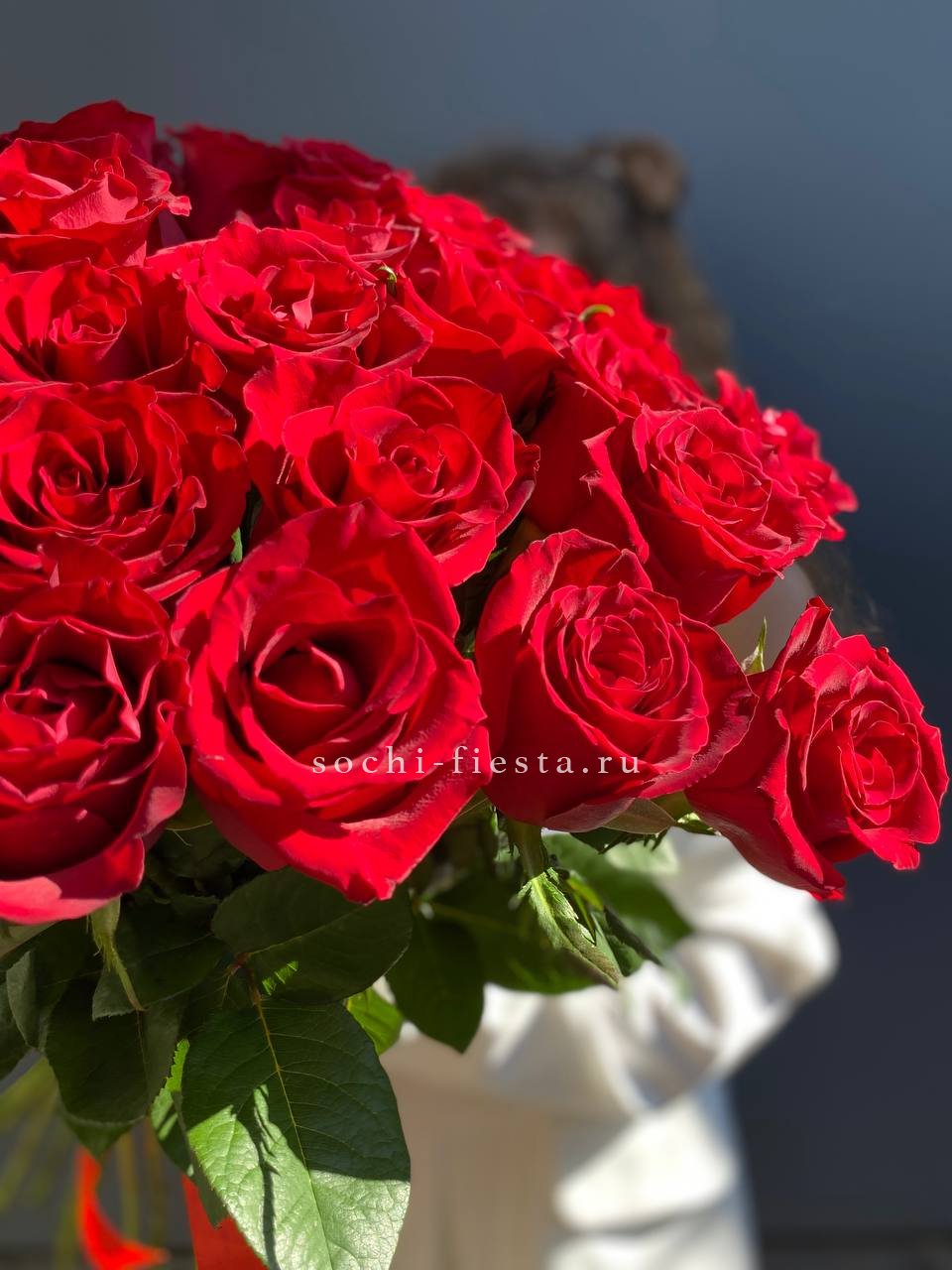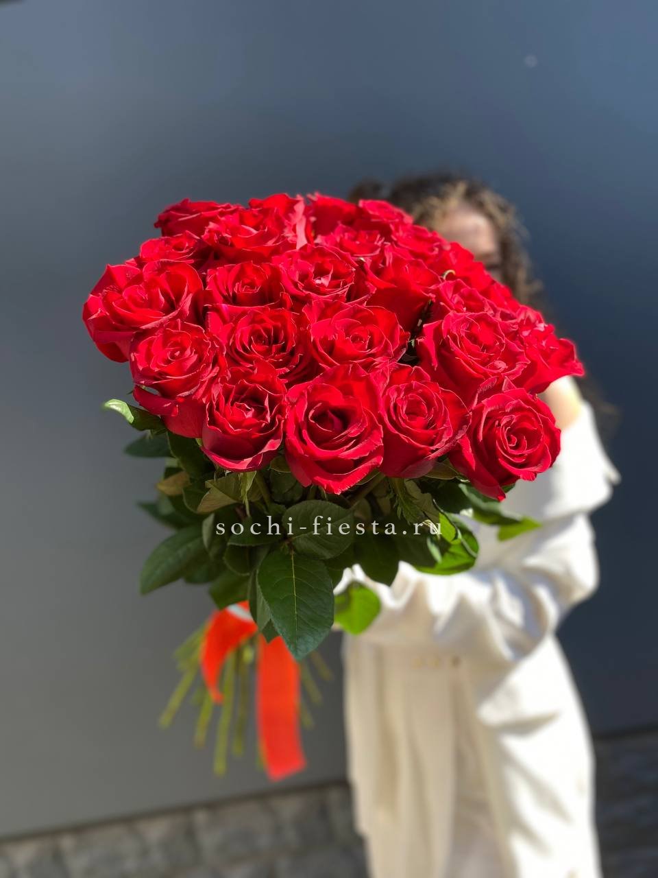 Двадцать пять белых бутонов раскрываются слоями и создают воздушную фактуру с глубиной. Голландские розы удерживают свежесть и сохраняют структуру долгое время.