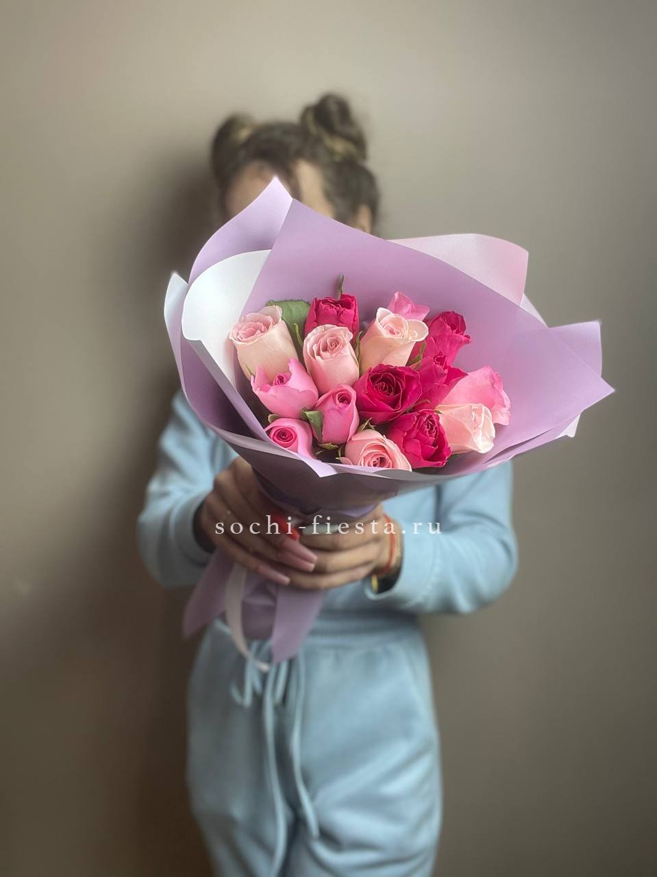 Пятнадцать кенийских роз в яркой палитре оттенков создают живую композицию с плотным силуэтом. Каждый бутон раскрывается по-своему, добавляя букету объём и динамику.
