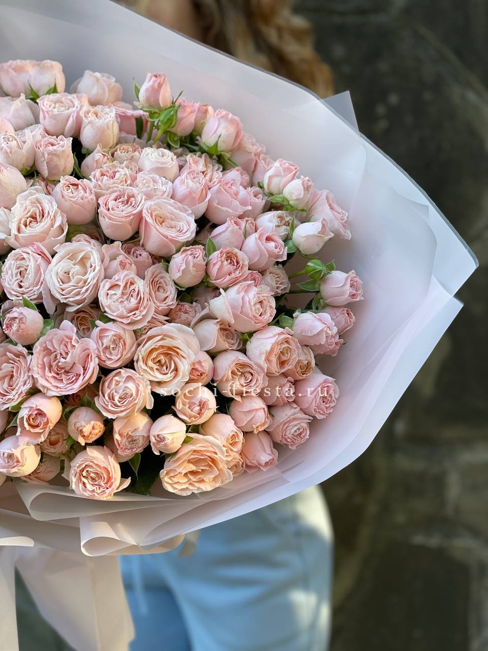 Пятьдесят одна кустовая роза собрана в плотный купол с множеством мелких бутонов на каждой ветке. Пышная композиция с ветками эвкалипта создает объемную форму и наполняет пространство свежестью. Яркий жест для тех, кто ценит масштаб и щедрость