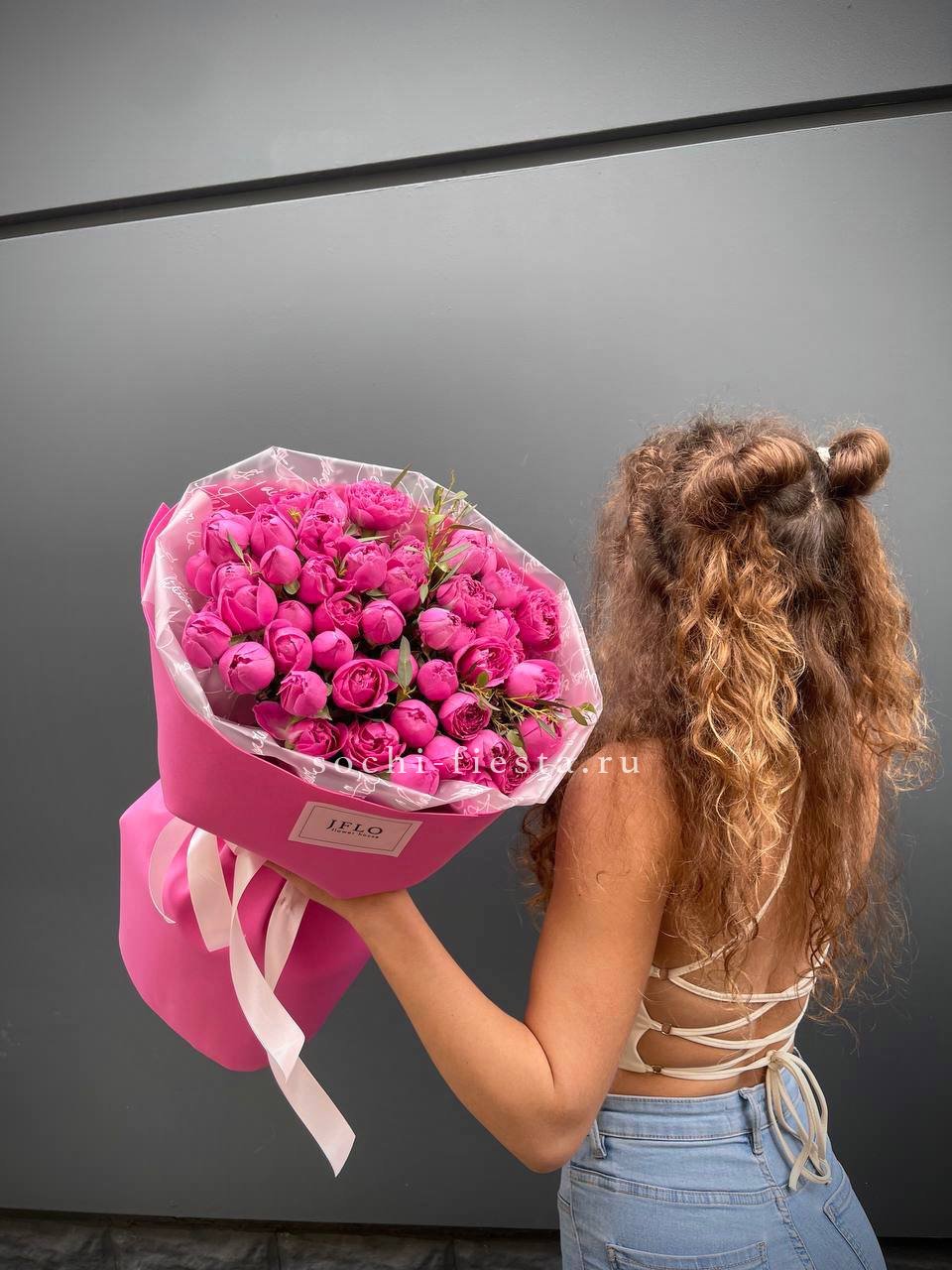 19 веток  пионовидных роз мисти баблс, лента, дизайнерская упаковка.