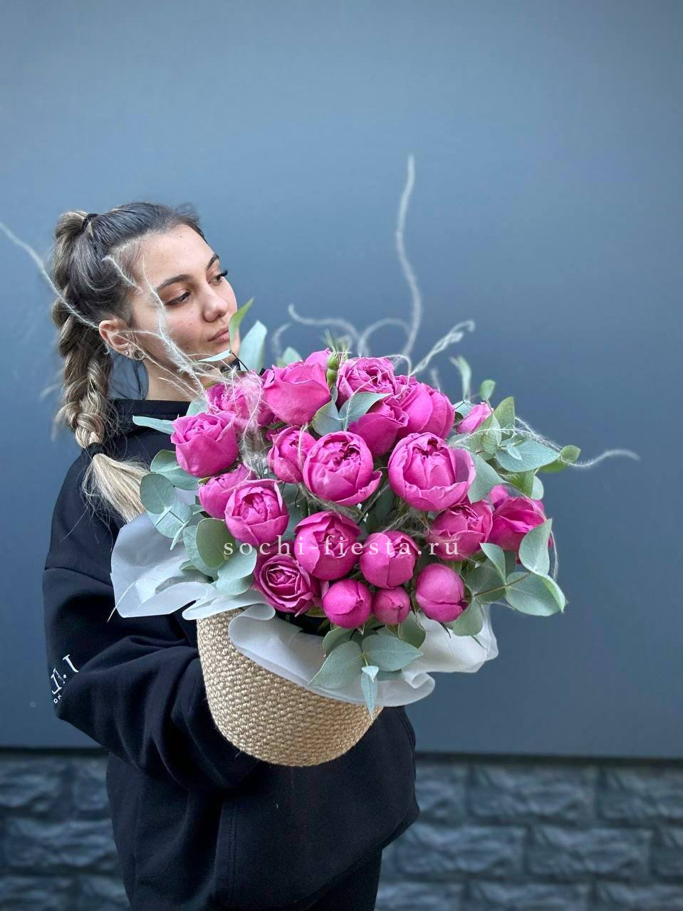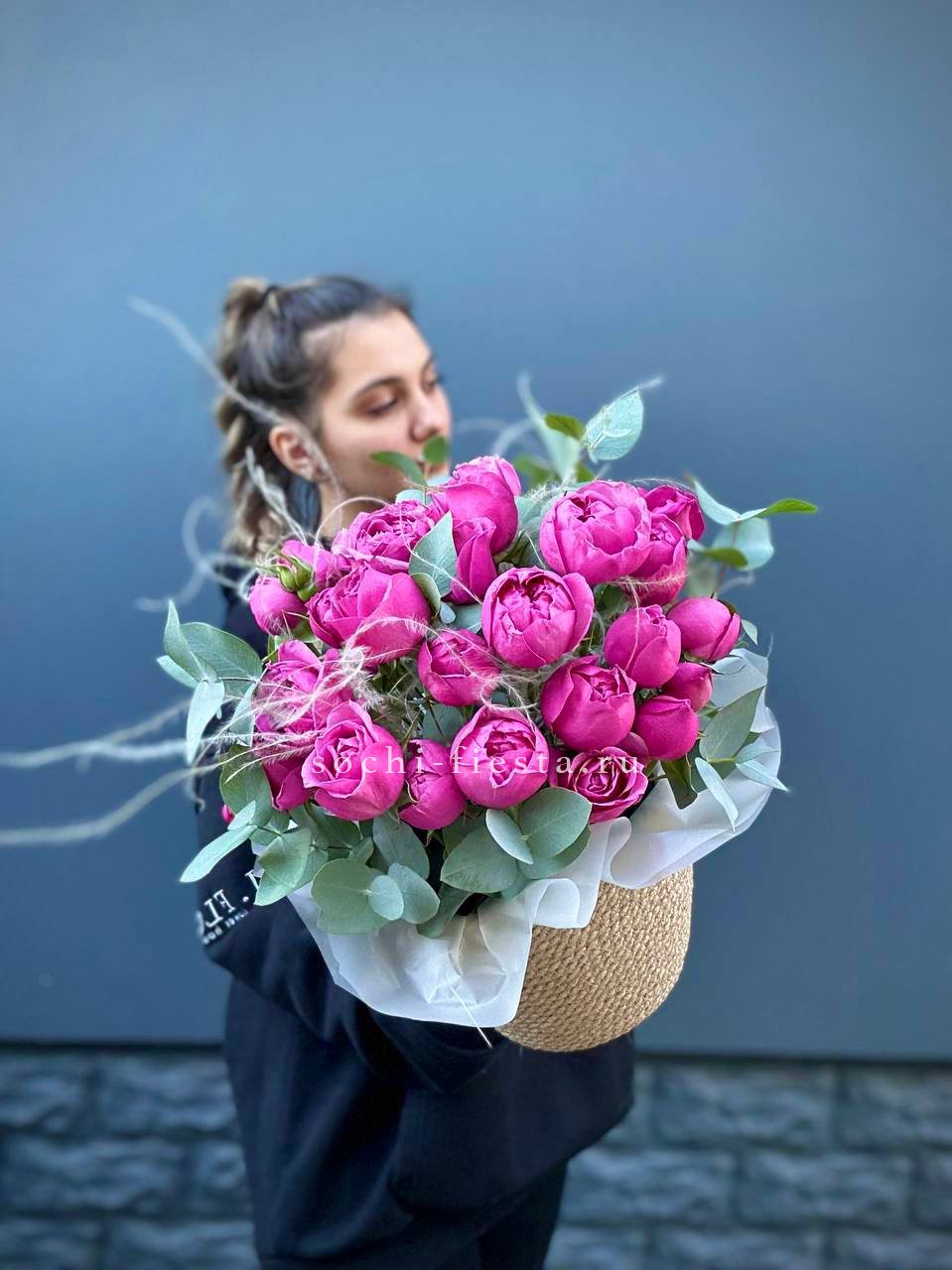 розы пионовидные 21шт, эвкалипт, пленка, лента.